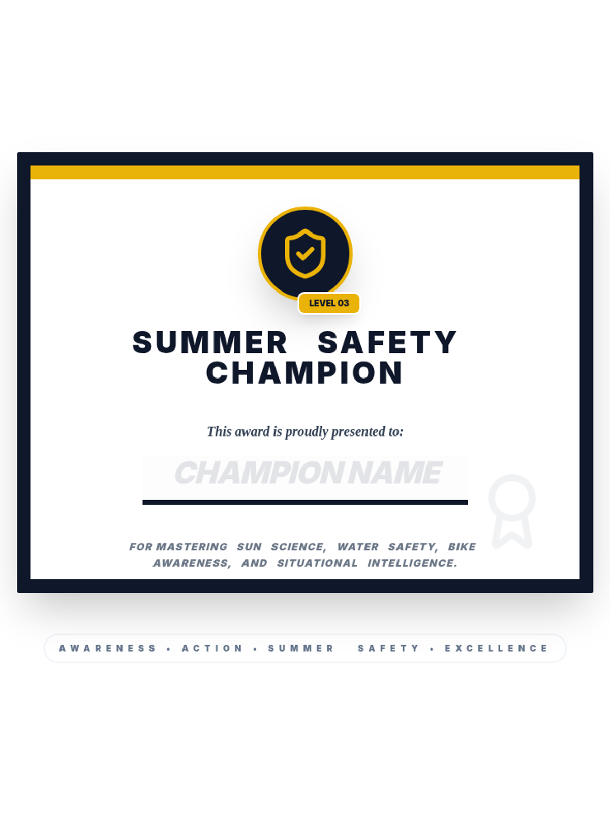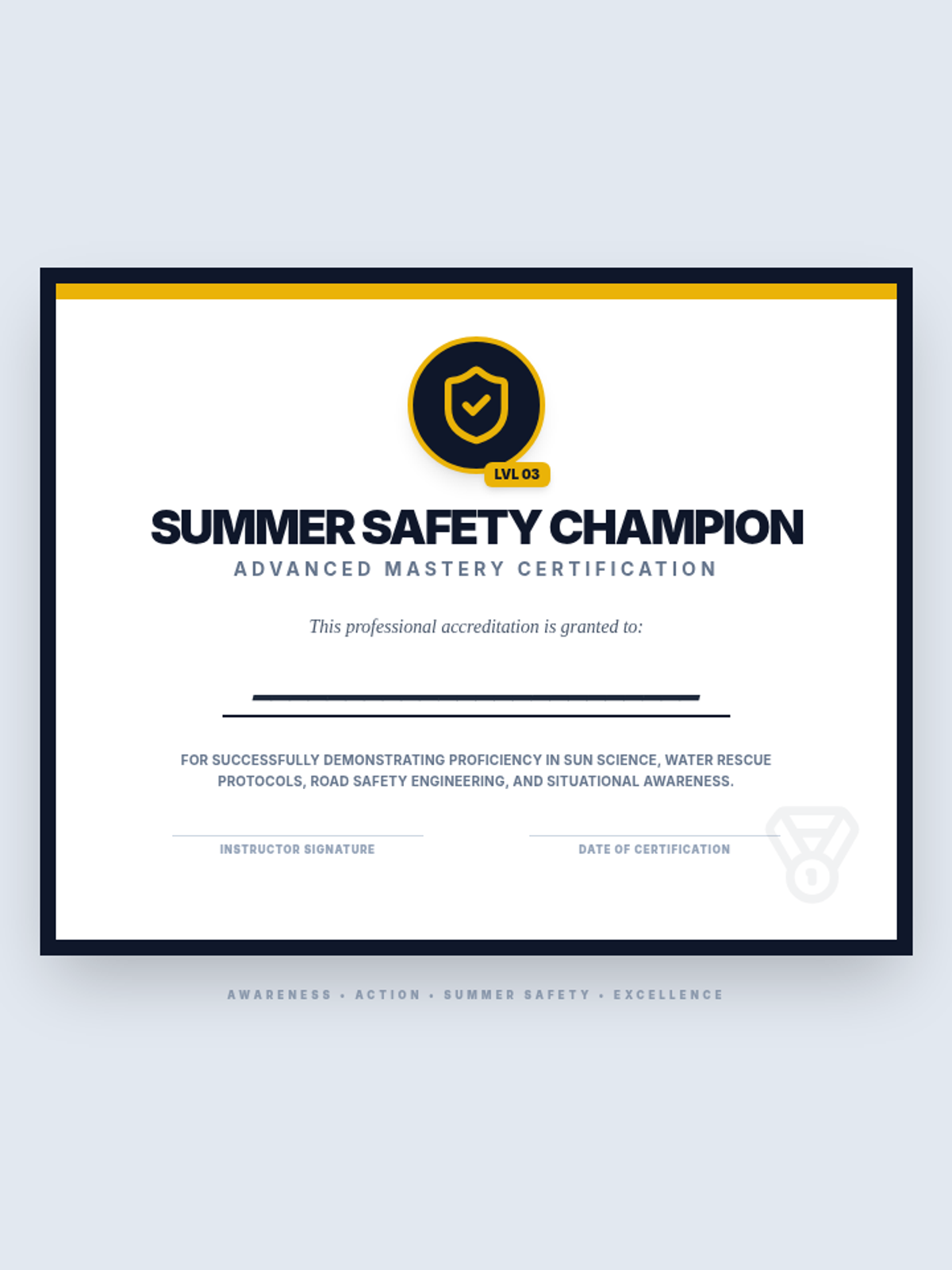 A sophisticated 'Summer Safety Champion' certificate for 3rd graders, now optimized for printing and featuring 'Summer Safety' branding.