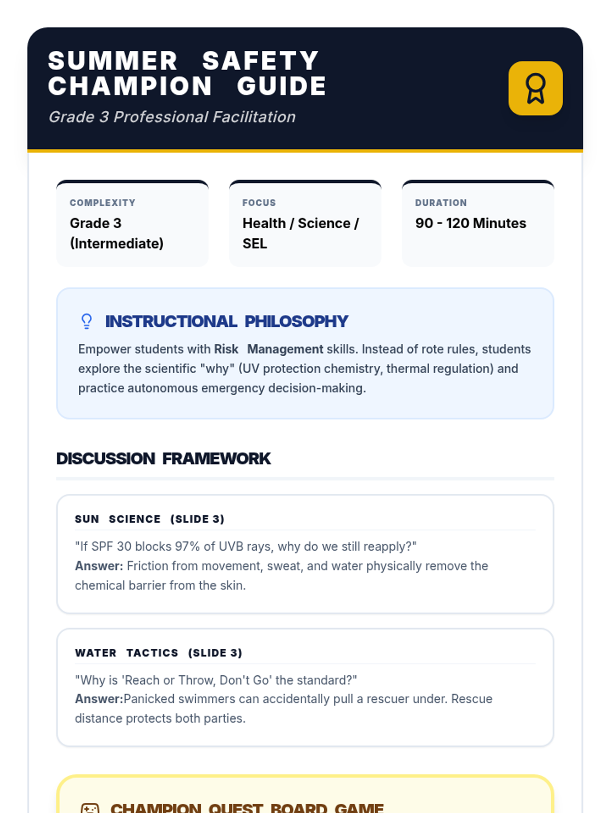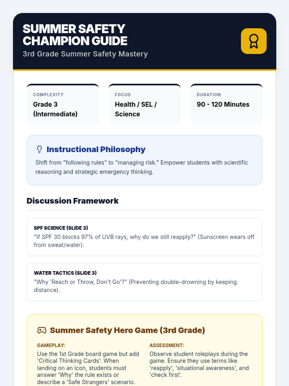 A comprehensive teacher facilitation guide for 3rd grade summer safety, updated with specific Grade 3 game instructions, standalone content, and optimized page layout.
