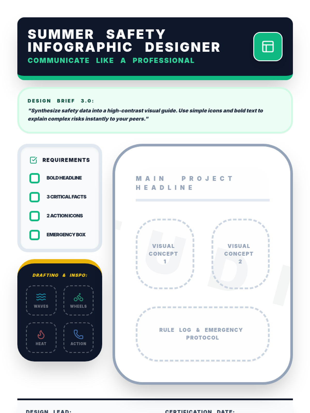 A professional-style infographic design worksheet for 3rd graders, now optimized to fit on a single page with 'Summer Safety' branding.