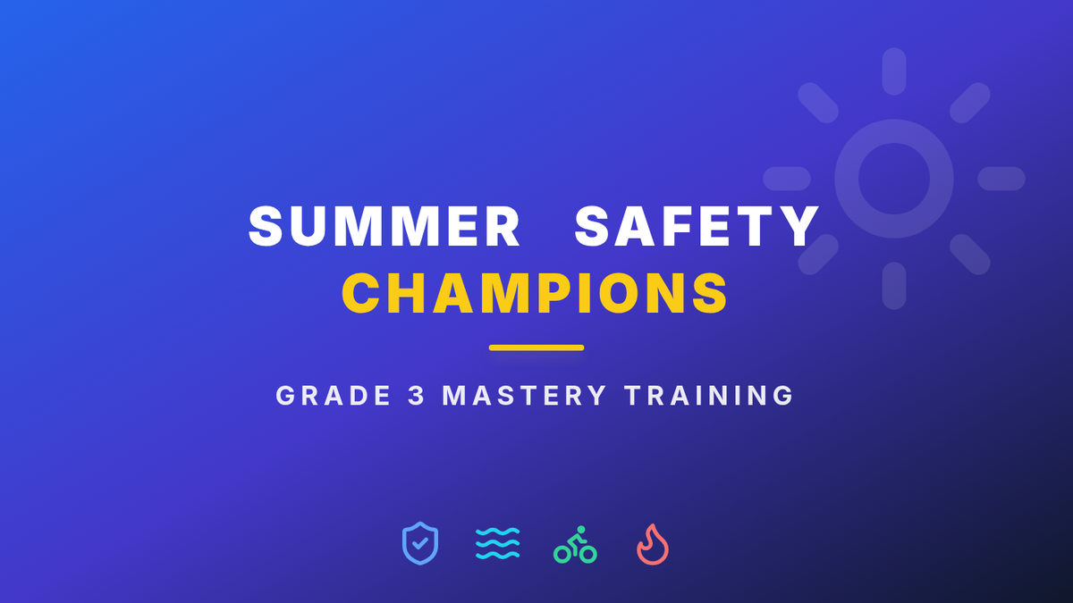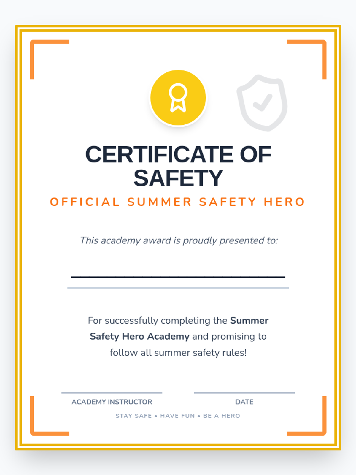A celebratory 'Summer Safety Hero' completion certificate for students.