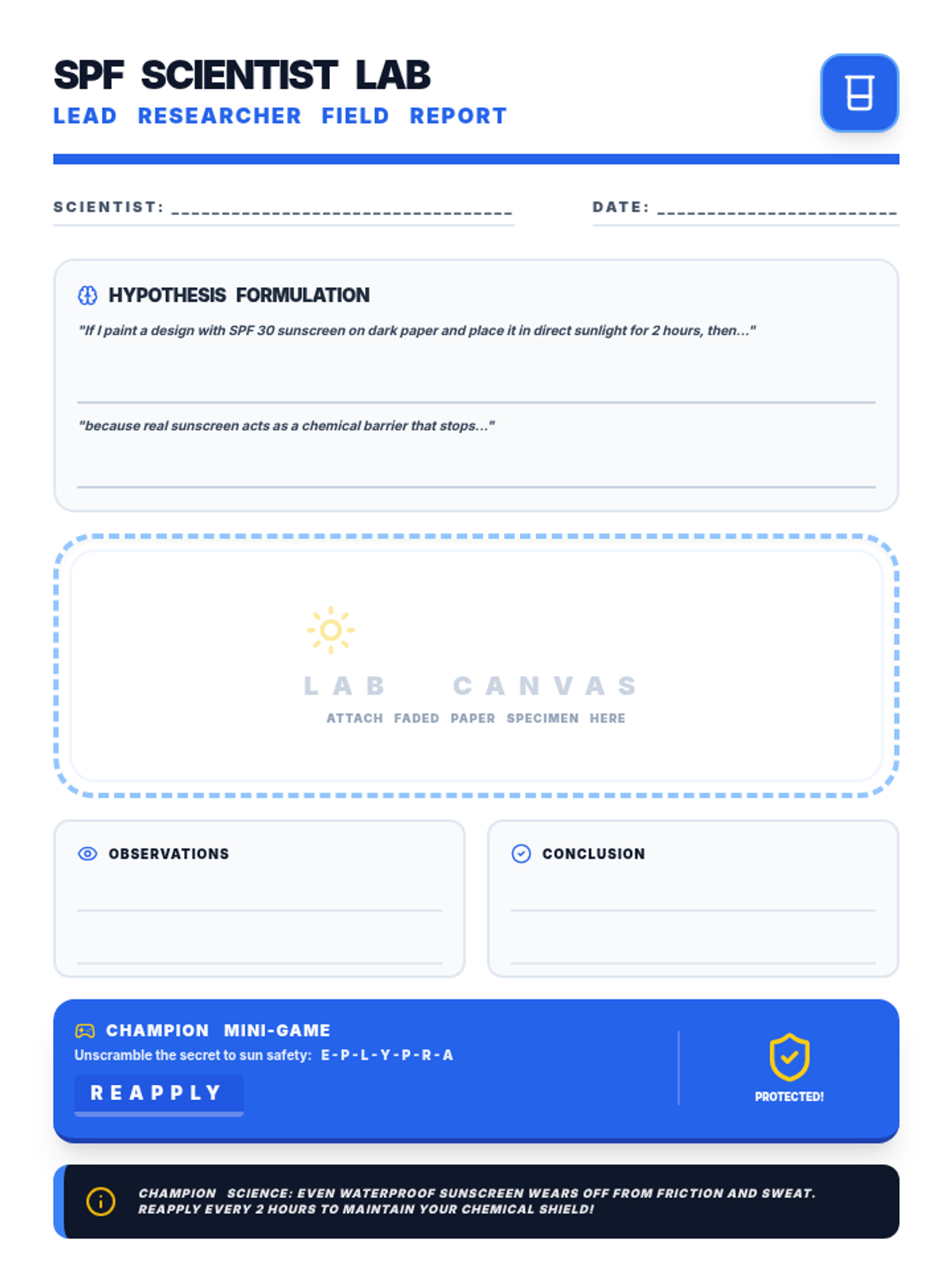 A scientific lab report for 3rd graders, optimized for a single page with 'Summer Safety' branding and an added UV Scramble mini-game.
