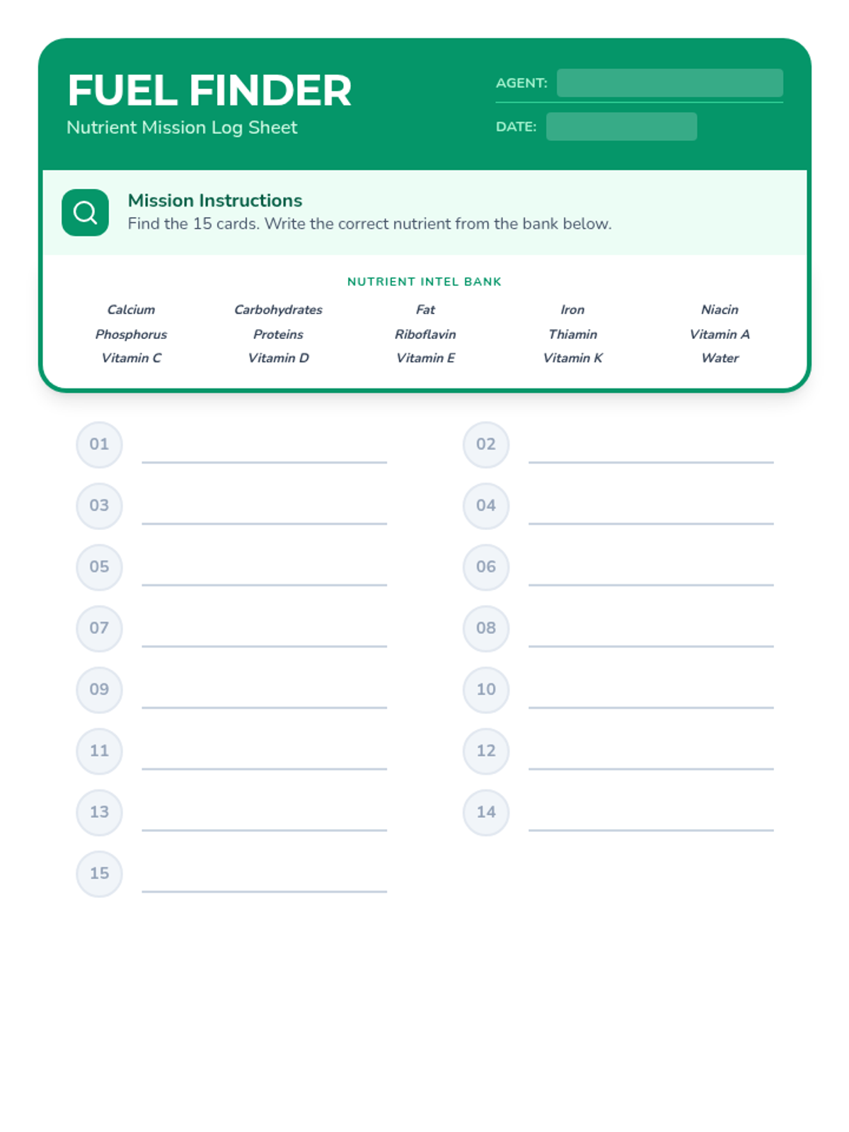 A mission-themed log sheet for students to record nutrient names as they find hidden task cards during the scavenger hunt.
