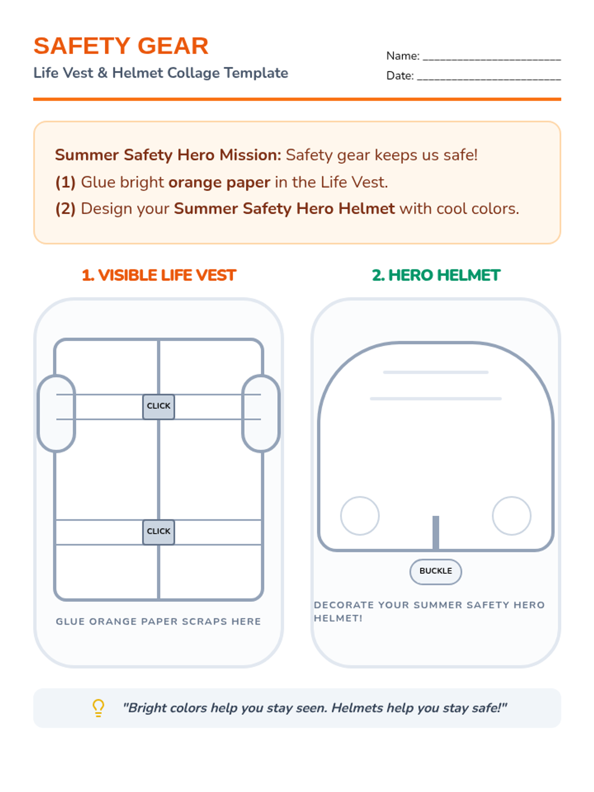 A collage activity sheet for 1st graders with updated 'Summer Safety Hero' terminology.
