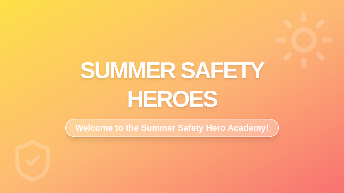 An updated 7-slide presentation for 1st graders introducing the 'Summer Safety Hero Academy' with themed lessons on summer health and safety rules.
