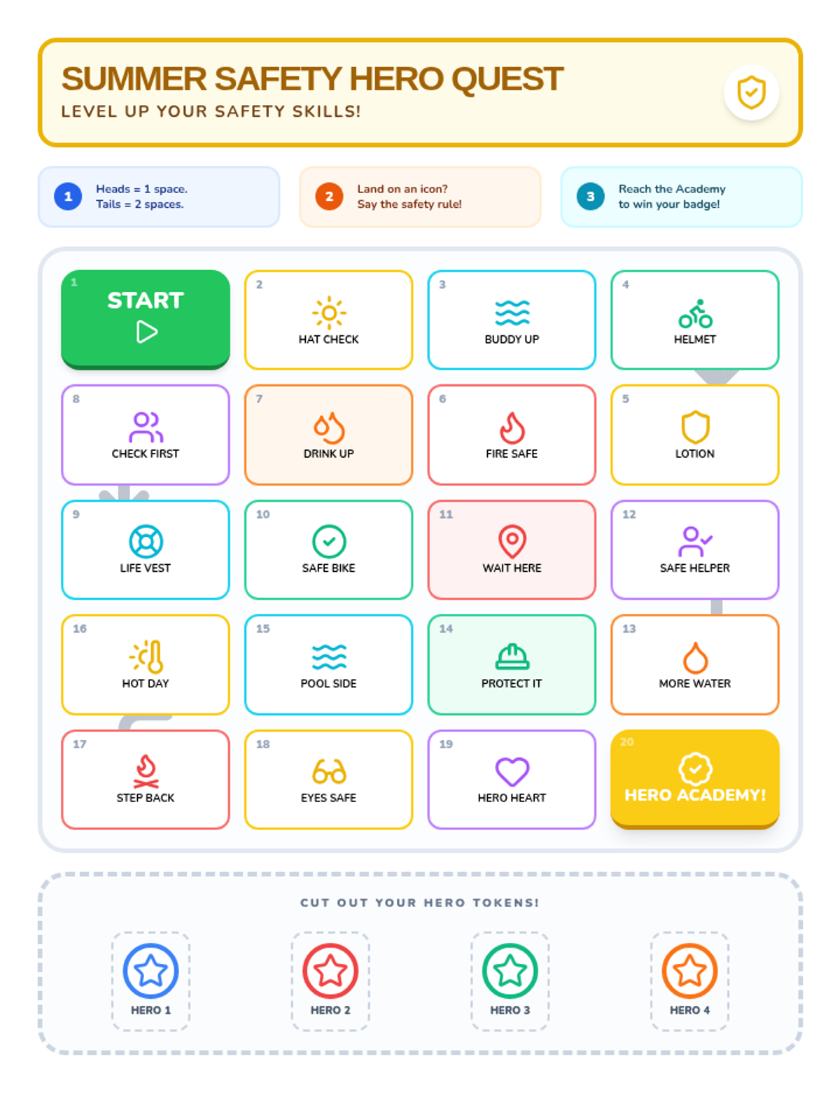 A printable board game for 1st graders where they navigate a safety-themed path, answering questions and practicing rules to reach the Summer Safety Hero Academy.