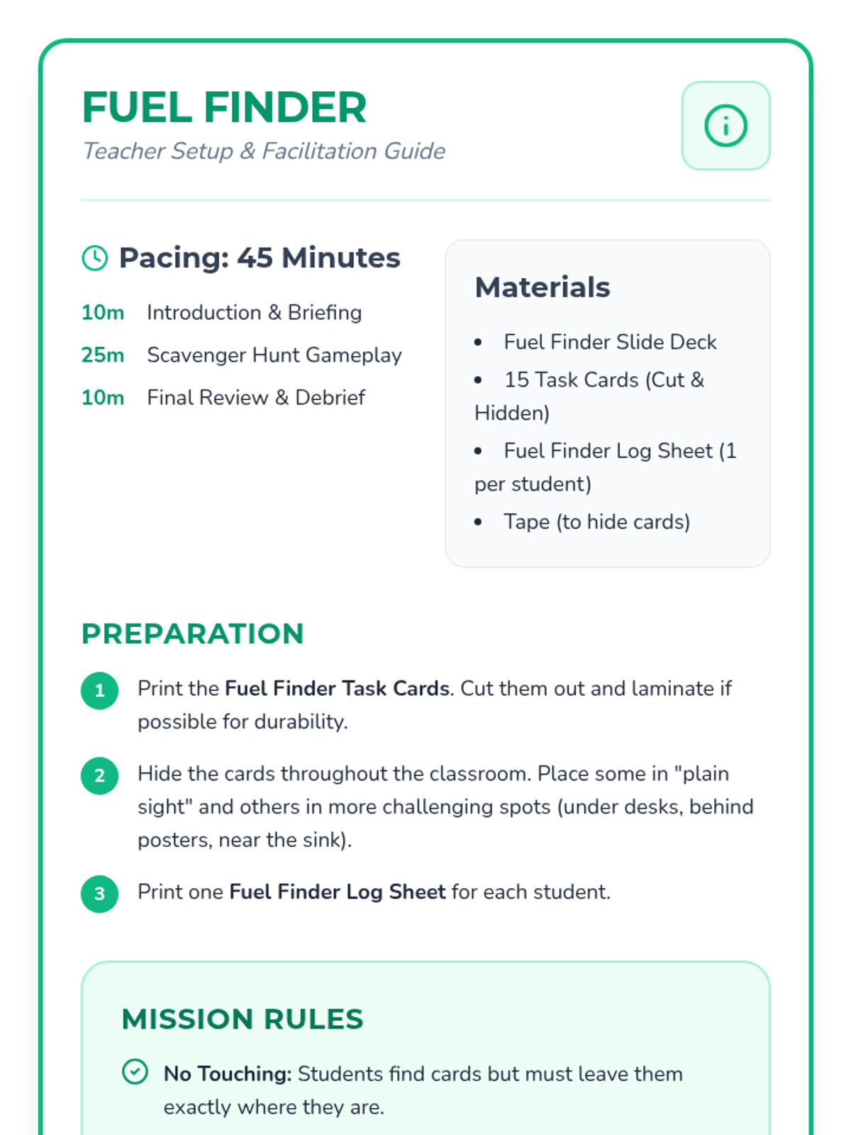 Teacher instructions and answer key for the Fuel Finder scavenger hunt, outlining prep steps and classroom management.