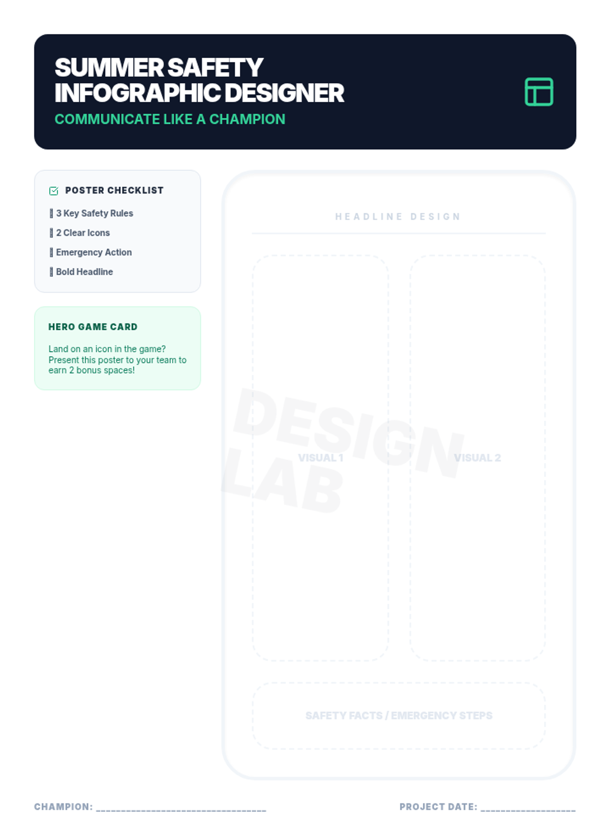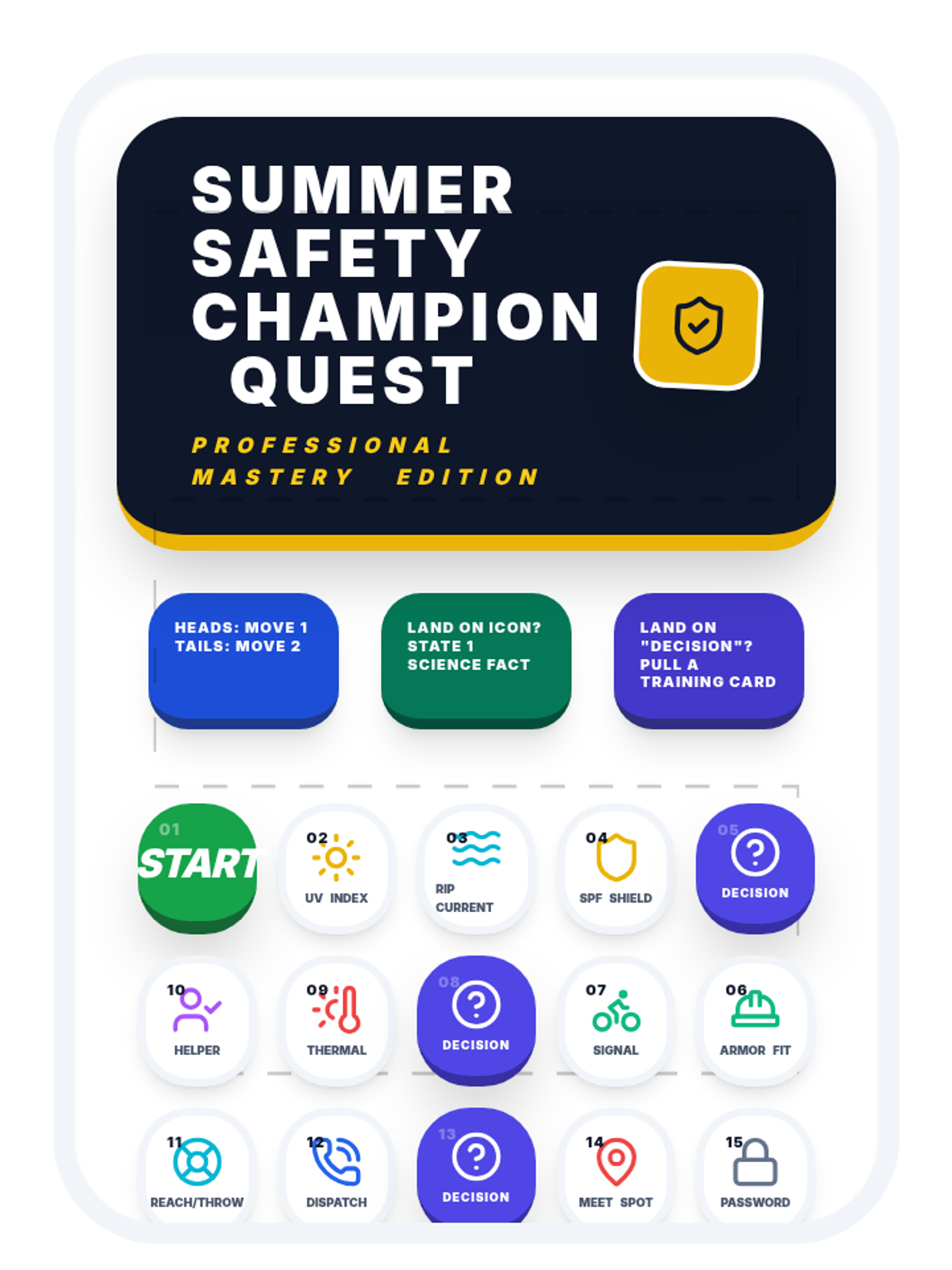 A professional-style board game for 3rd graders focused on advanced summer safety concepts, including scientific facts and situational decision-making. Includes Decision Cards on Page 2.
