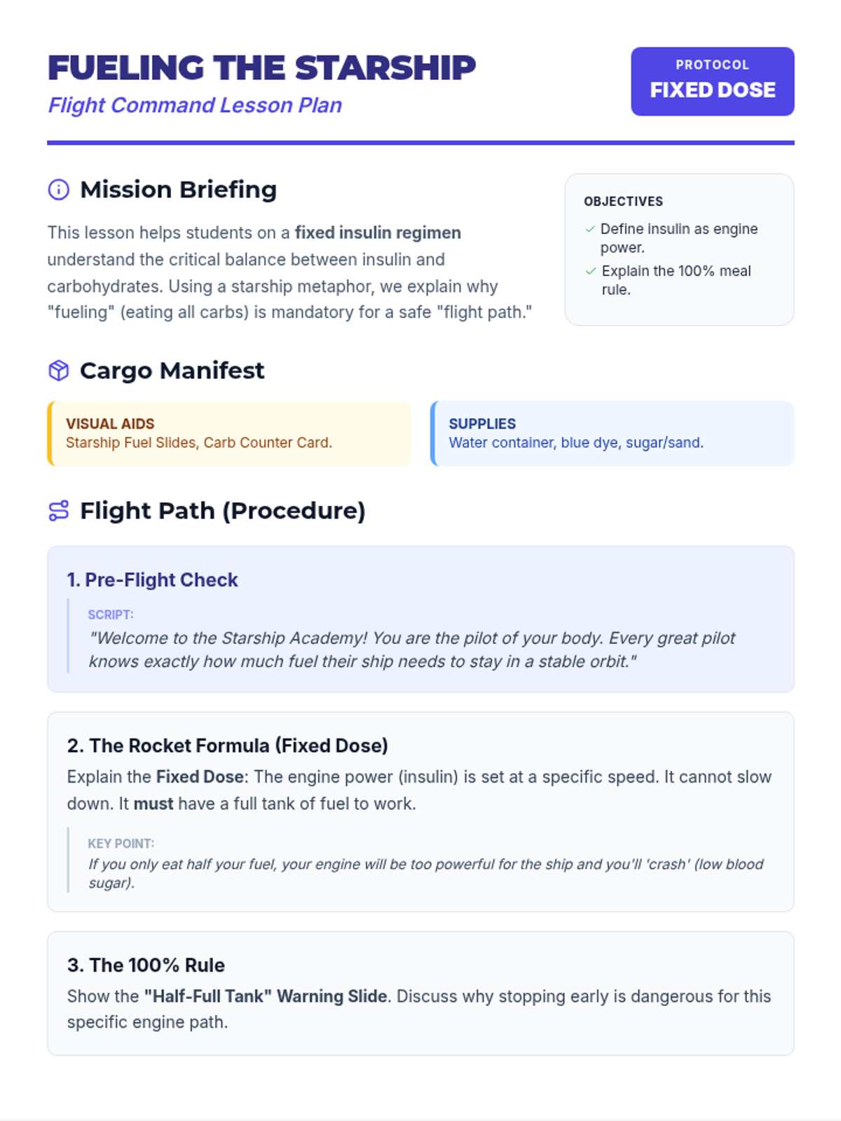 A detailed lesson plan for educators or school nurses to teach newly diagnosed diabetic students on a fixed insulin dose the importance of finishing their meals. It uses a starship metaphor to explain the balance between insulin and carbohydrates.