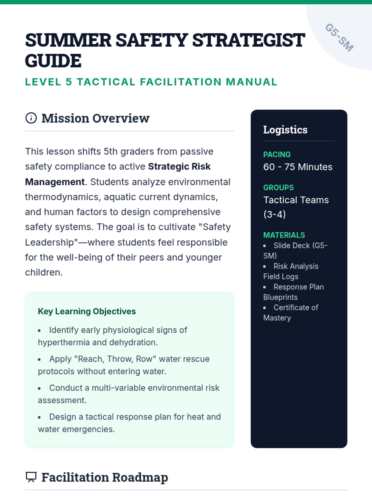A comprehensive teacher facilitation guide for 5th grade summer safety, focused on strategic risk management, leadership, and technical safety analysis. Now with optimized page layout and corrected formatting.