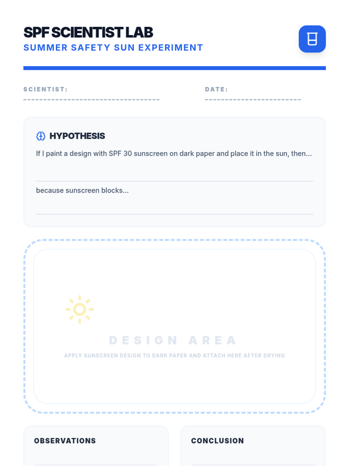 A scientific lab report and experimental painting worksheet for 3rd graders, now optimized to fit on a single page with 'Summer Safety' branding.