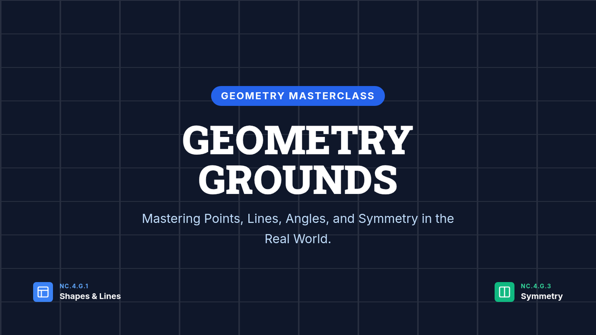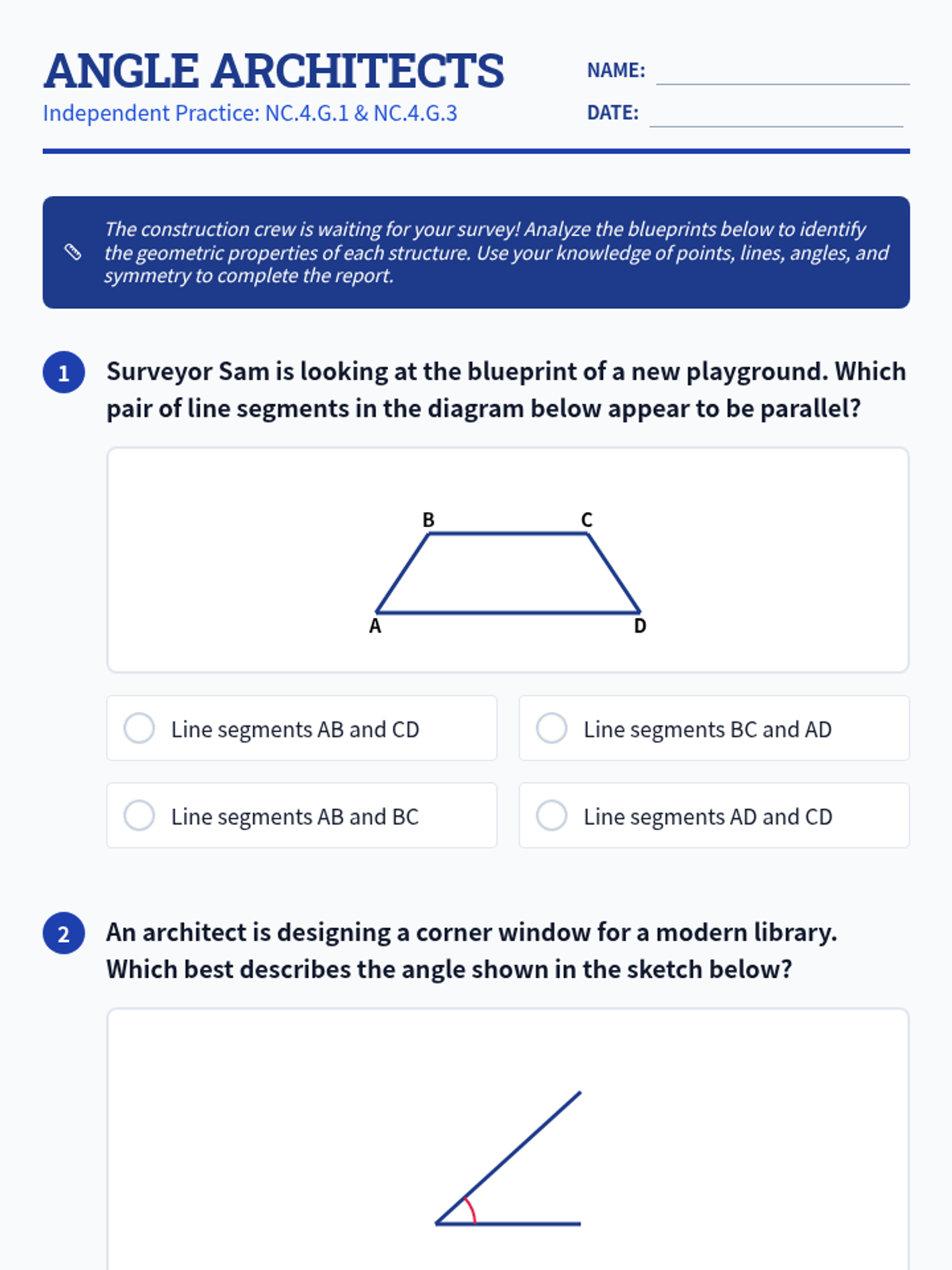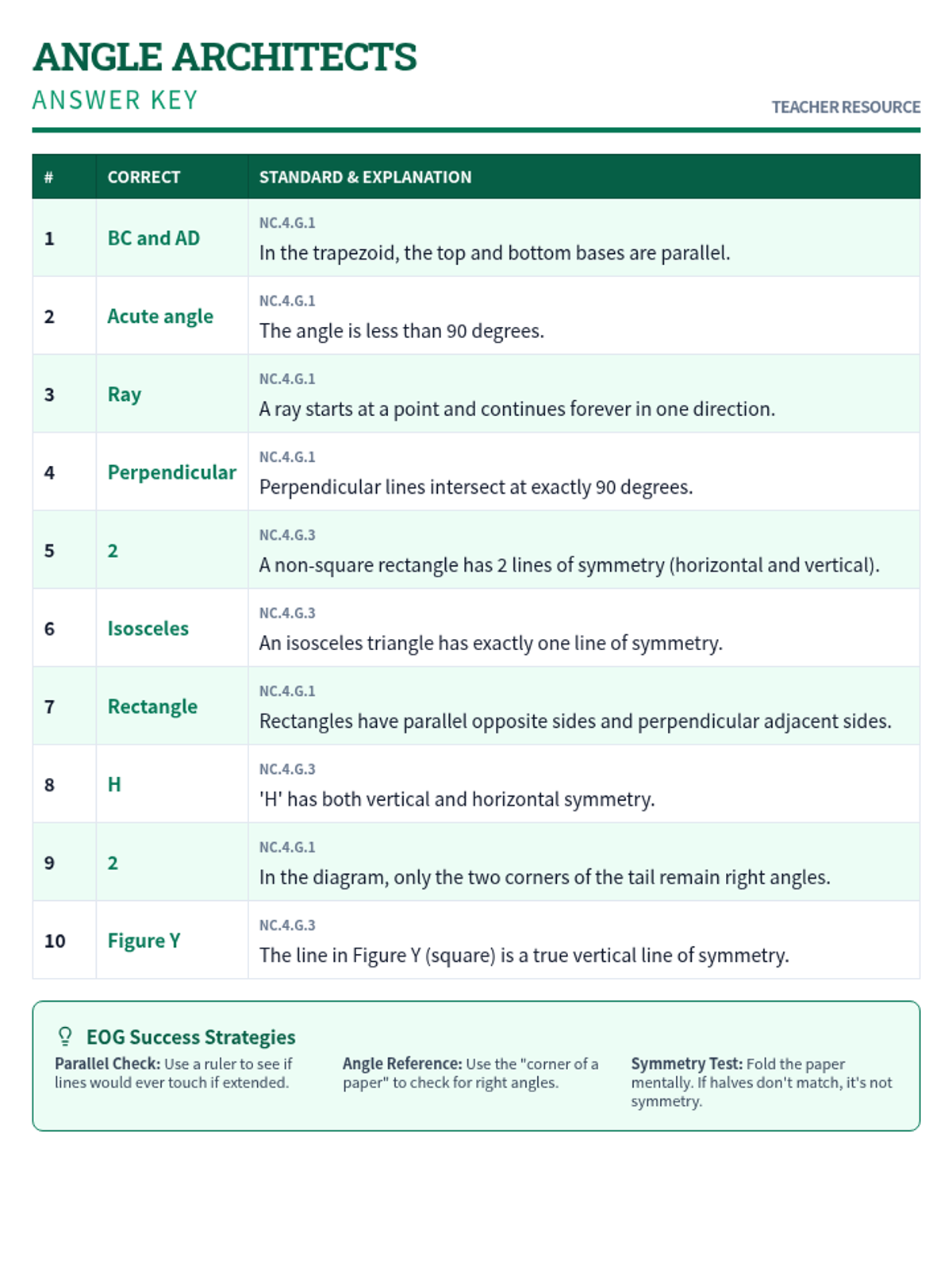 A rigorous, blueprint-themed geometry worksheet focusing on NC standards G.1 and G.3. Students identify points, lines, angles, and symmetry through 10 multiple-choice questions designed to mirror EOG rigor. Revised for better page breaks and diagram accuracy.