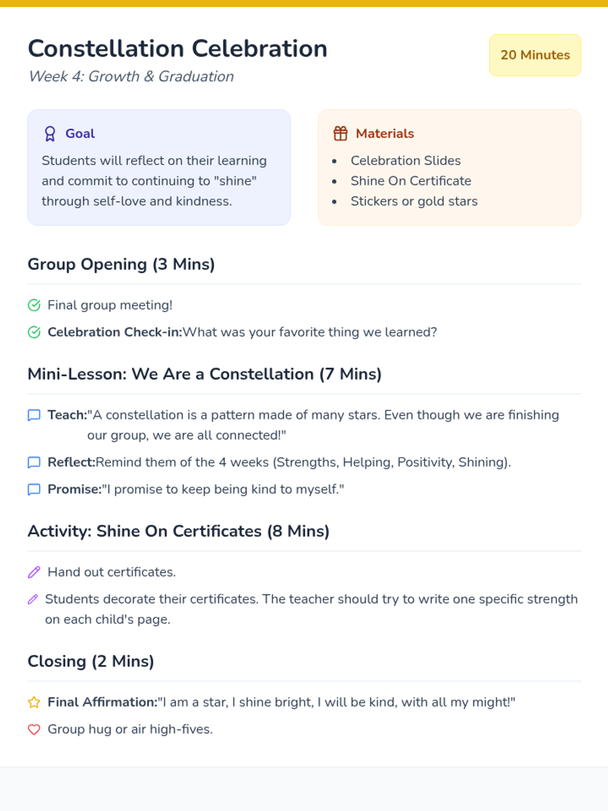 Final slide deck for the self-esteem group, celebrating student progress and summarizing key takeaways from the 4-week program.