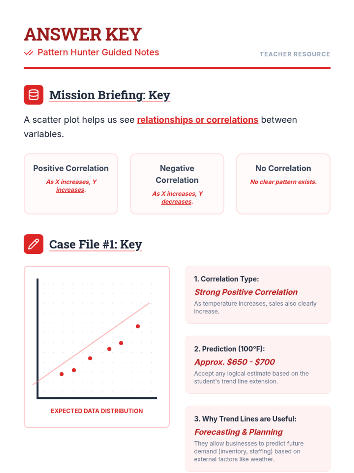 An answer key and grading guide for the 'Pattern Hunter Guided Notes', featuring a visual plotting guide, sample analysis responses, and a mini-rubric for teacher use.