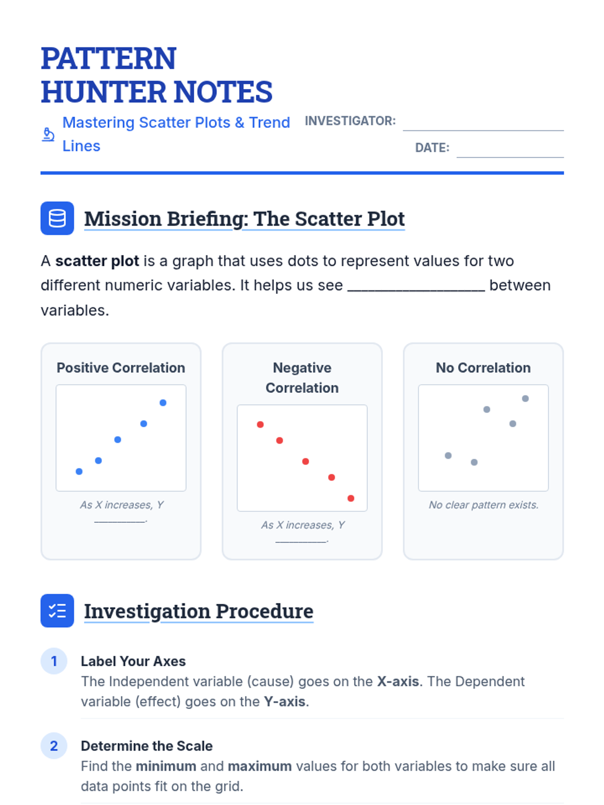 A comprehensive 2-page guided notes worksheet for middle or high school students on scatter plots and trend lines. It includes definitions of correlation, a step-by-step investigation procedure, and a guided practice case study with data plotting and analysis.