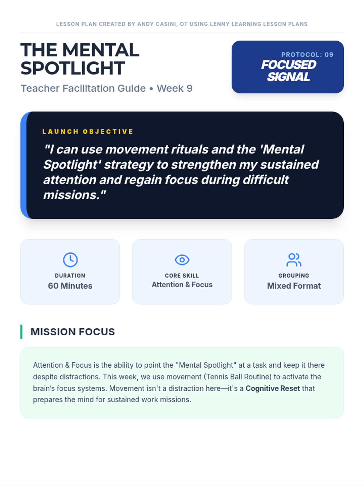 A five-page comprehensive teacher facilitation guide for Week 9: Attention & Focus. Includes a Learning Target, mission focus on the 'Mental Spotlight', timed instructional flow, YouTube briefing links, and a detailed breakdown of the Tennis Ball Focus Ritual with classroom transfer routines. Layout optimized to ensure no text cutoff and 8px attribution header.