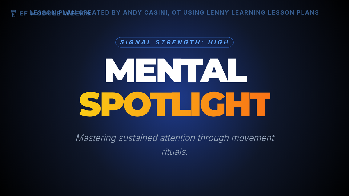 A high-impact 16:9 slide deck for Week 9: Attention & Focus. Features 5 timed levels for the Tennis Ball Focus Routine (Single hand to Simultaneous + Clap) and introduces 'Micro Focus Drills' for classroom resets. Strictly follows text minimums and includes Andy Casini's attribution. Layout updated for single-line centered attribution at 24px.