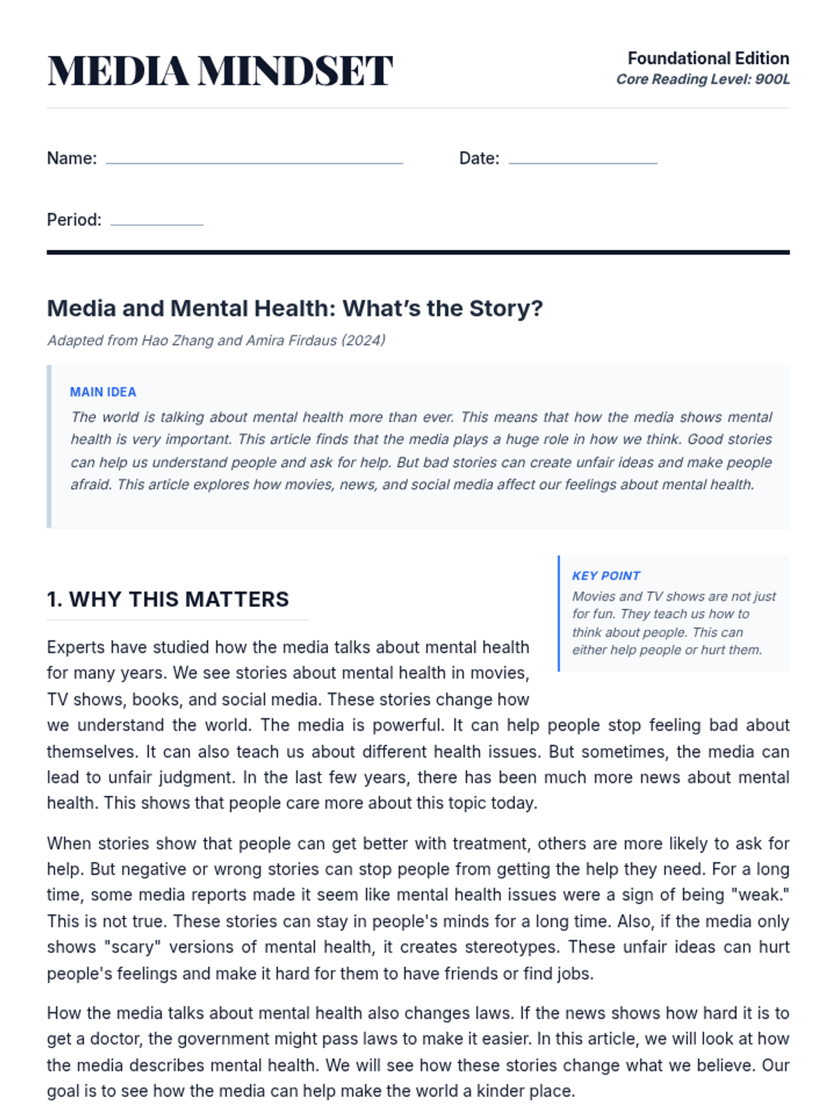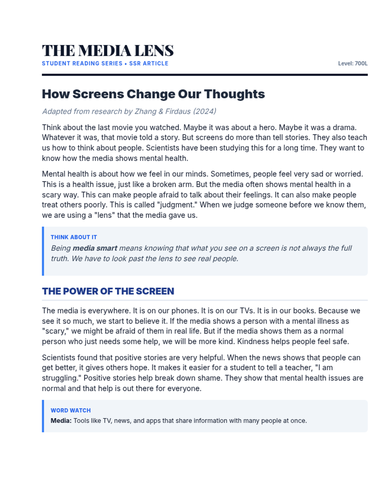 A simplified version of the Media Mindset Handout, rewritten at an 1100L Lexile level for high school students. It maintains the original structure while using more accessible language, clearer sentence structures, and a dedicated glossary to support reading comprehension.
