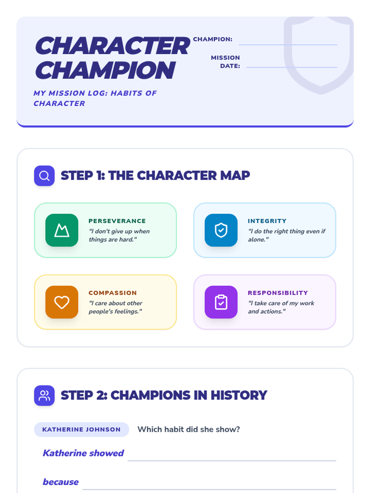 A scaffolded reflection worksheet for students to identify EL Education habits of character in historical figures and themselves. REVISED for better page flow, uniform line alignment, and higher contrast headers.