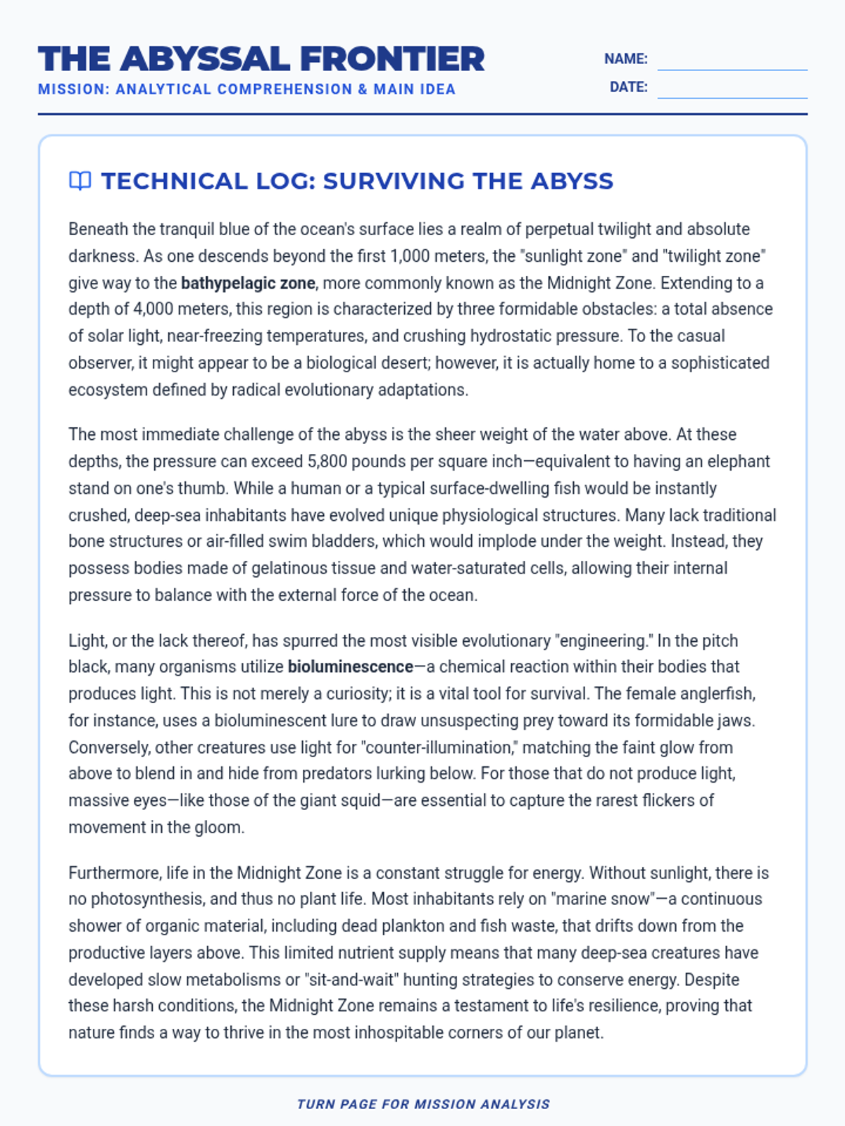A rigorous deep-sea reading comprehension worksheet featuring a lengthy technical passage about the Midnight Zone, advanced vocabulary matching, and EOG-style multiple-choice questions specifically aligned to RI.3.2 (Main idea and supporting details). Revised for a clean 2-page layout.