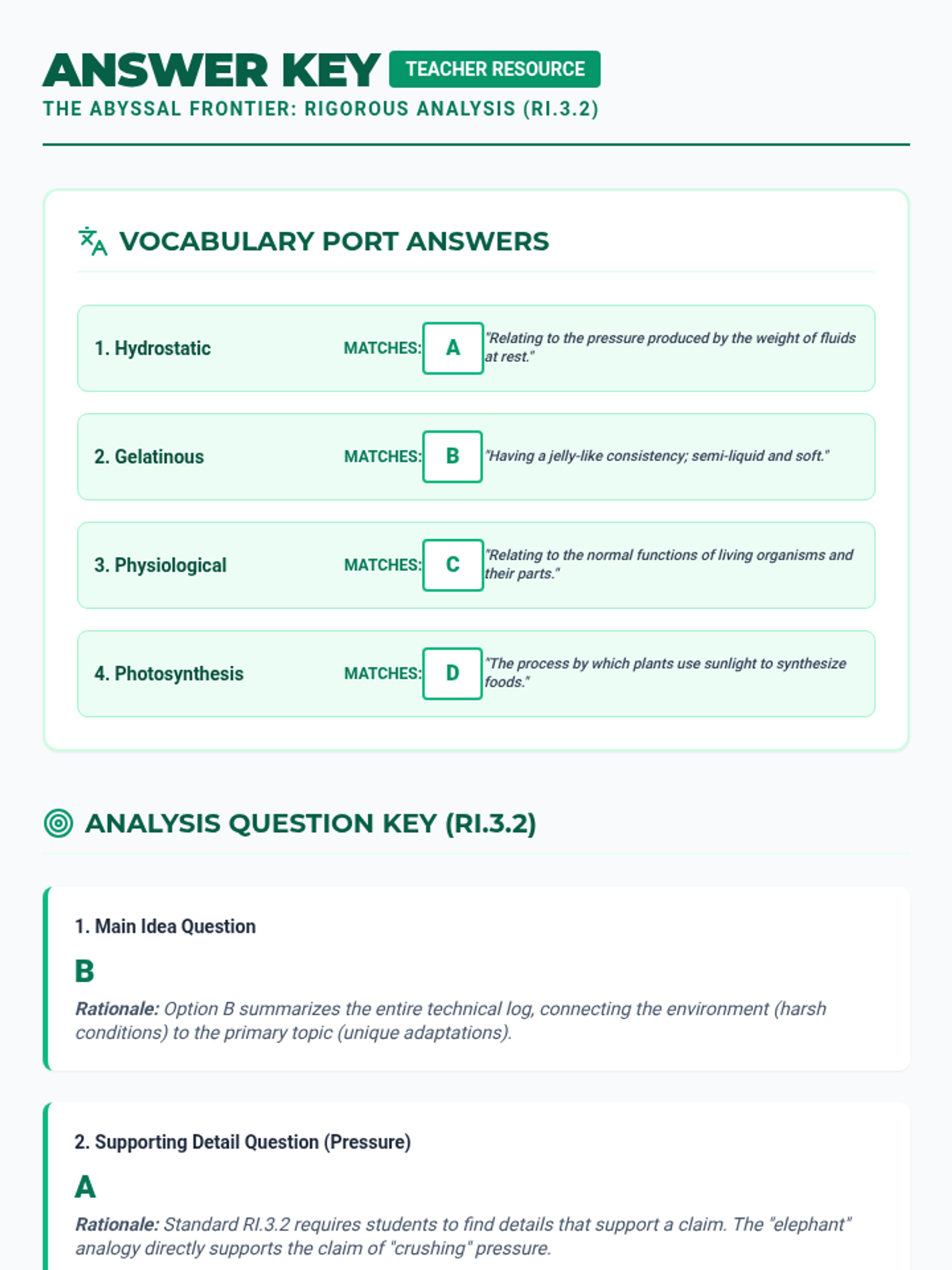 Updated answer key for the rigorous Abyssal Frontier worksheet, featuring questions and rationales specifically aligned to RI.3.2 (Main Idea and Supporting Details).
