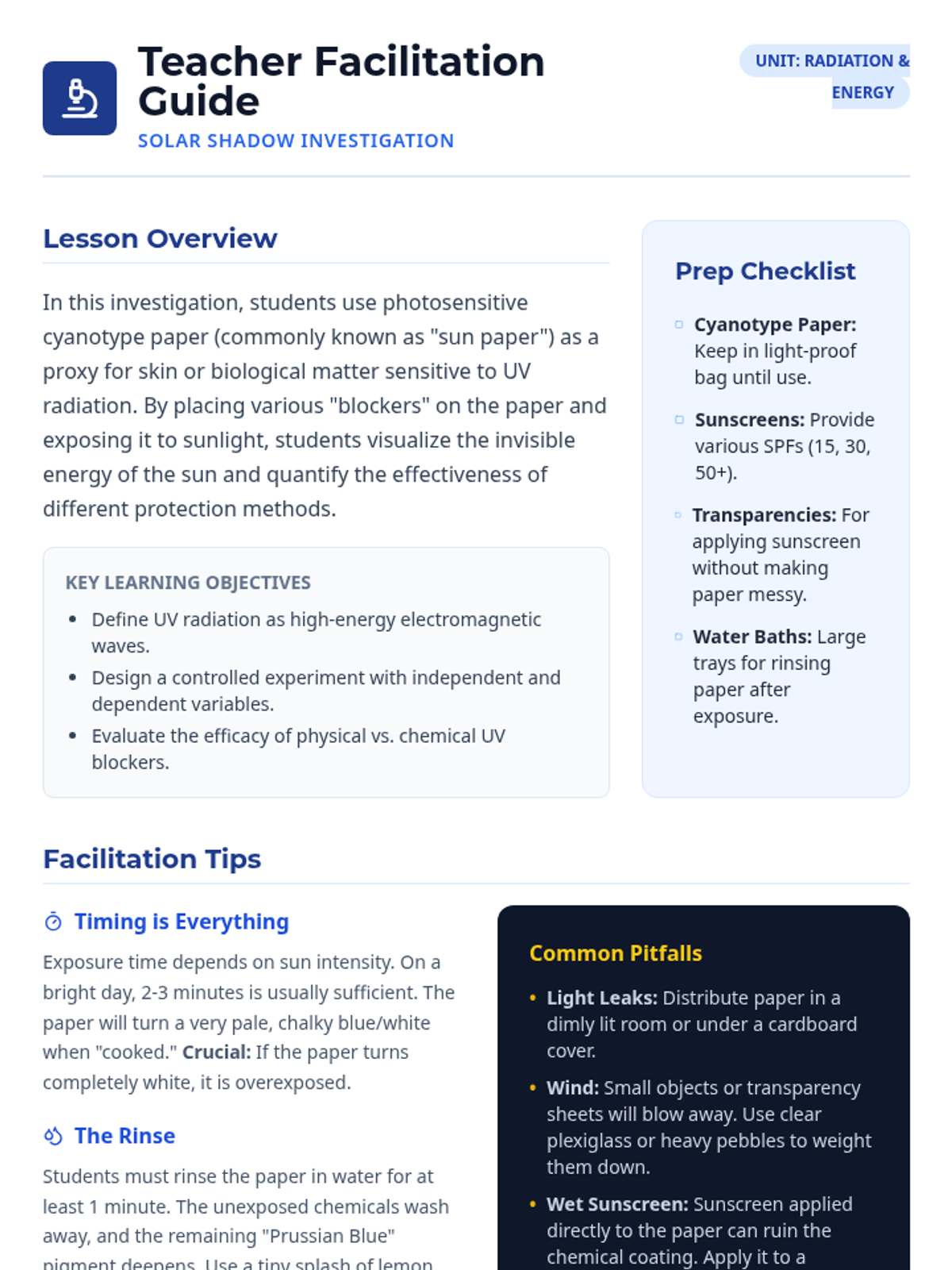 A teacher facilitation guide for the Solar Shadow Lab, featuring setup instructions, common pitfalls, a discussion guide, and a complete answer key for the student worksheet.