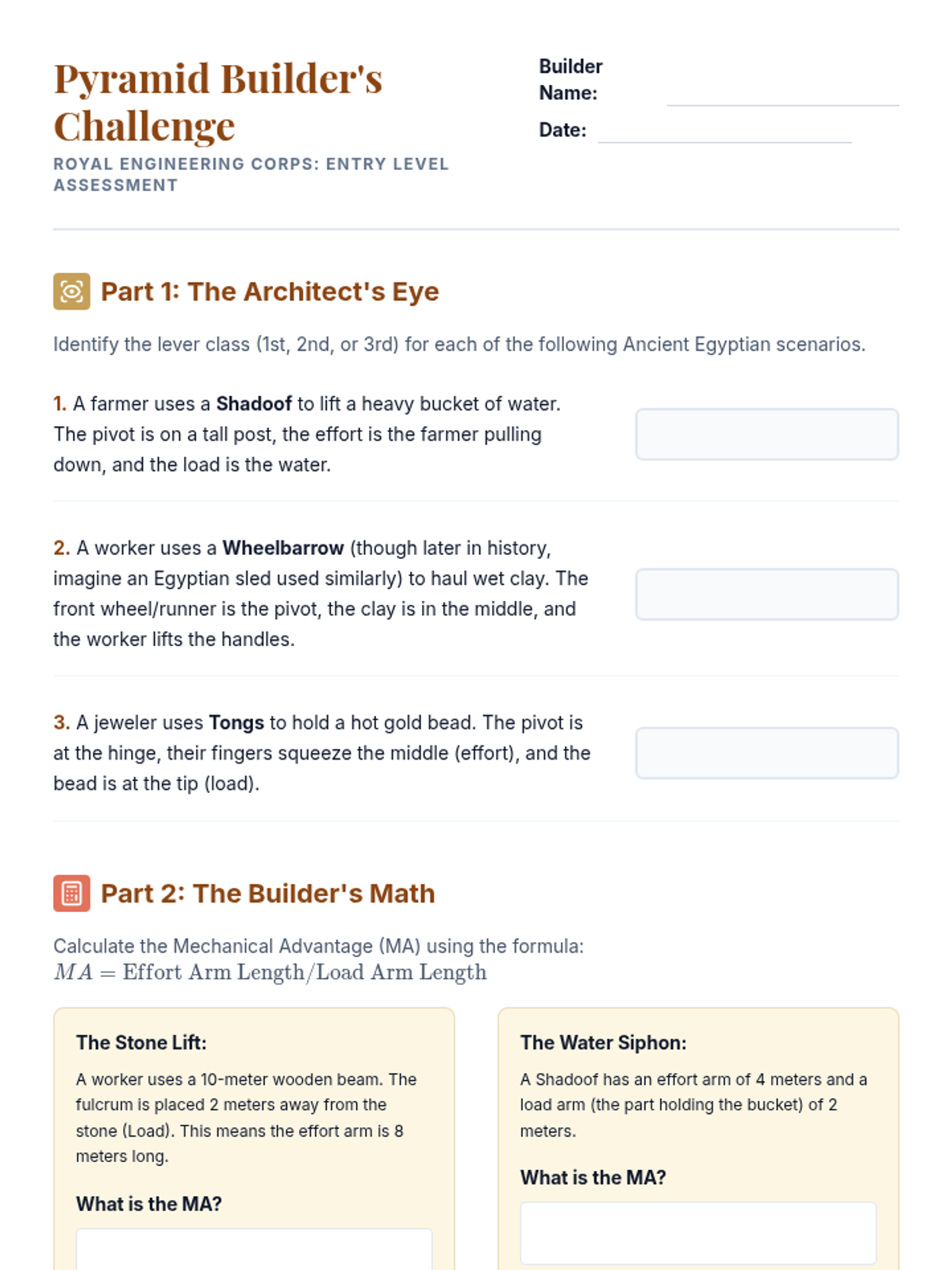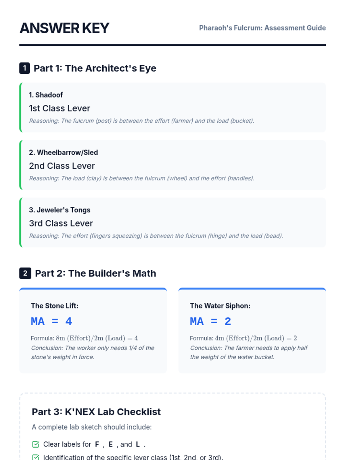 Answer key for the Pyramid Builder's Challenge Worksheet, providing classification solutions and step-by-step mechanical advantage calculations.