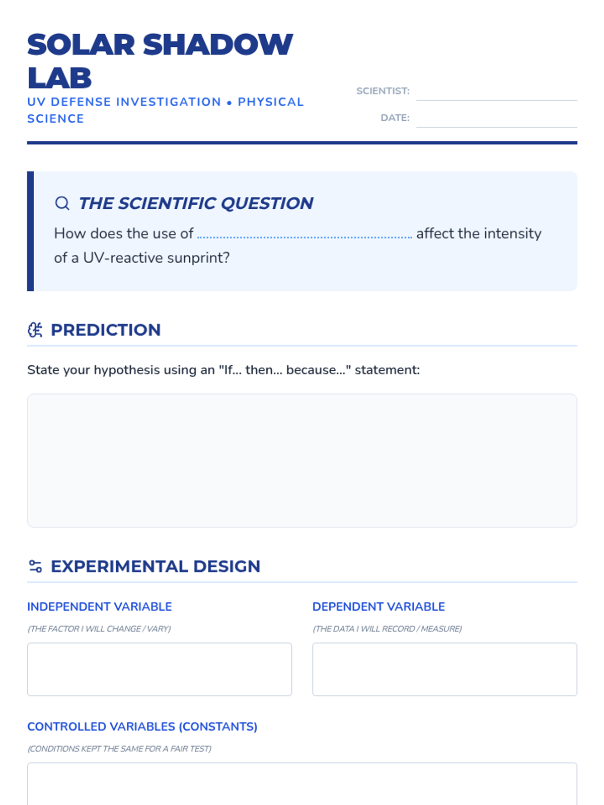 A comprehensive lab write-up template for a sun paper (cyanotype) experiment, featuring sections for hypothesis building, variable identification, data collection via sketching and ranking, and reflective analysis.