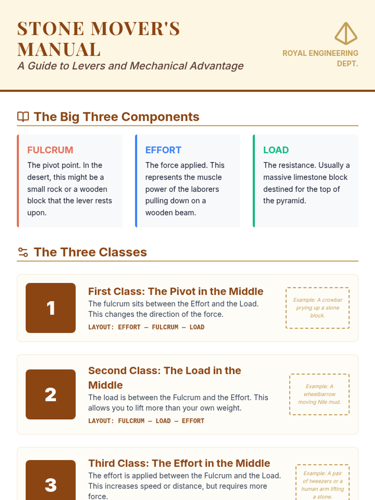 Reference information sheet for students explaining the three classes of levers, their components, and the concept of mechanical advantage through an Ancient Egyptian lens.