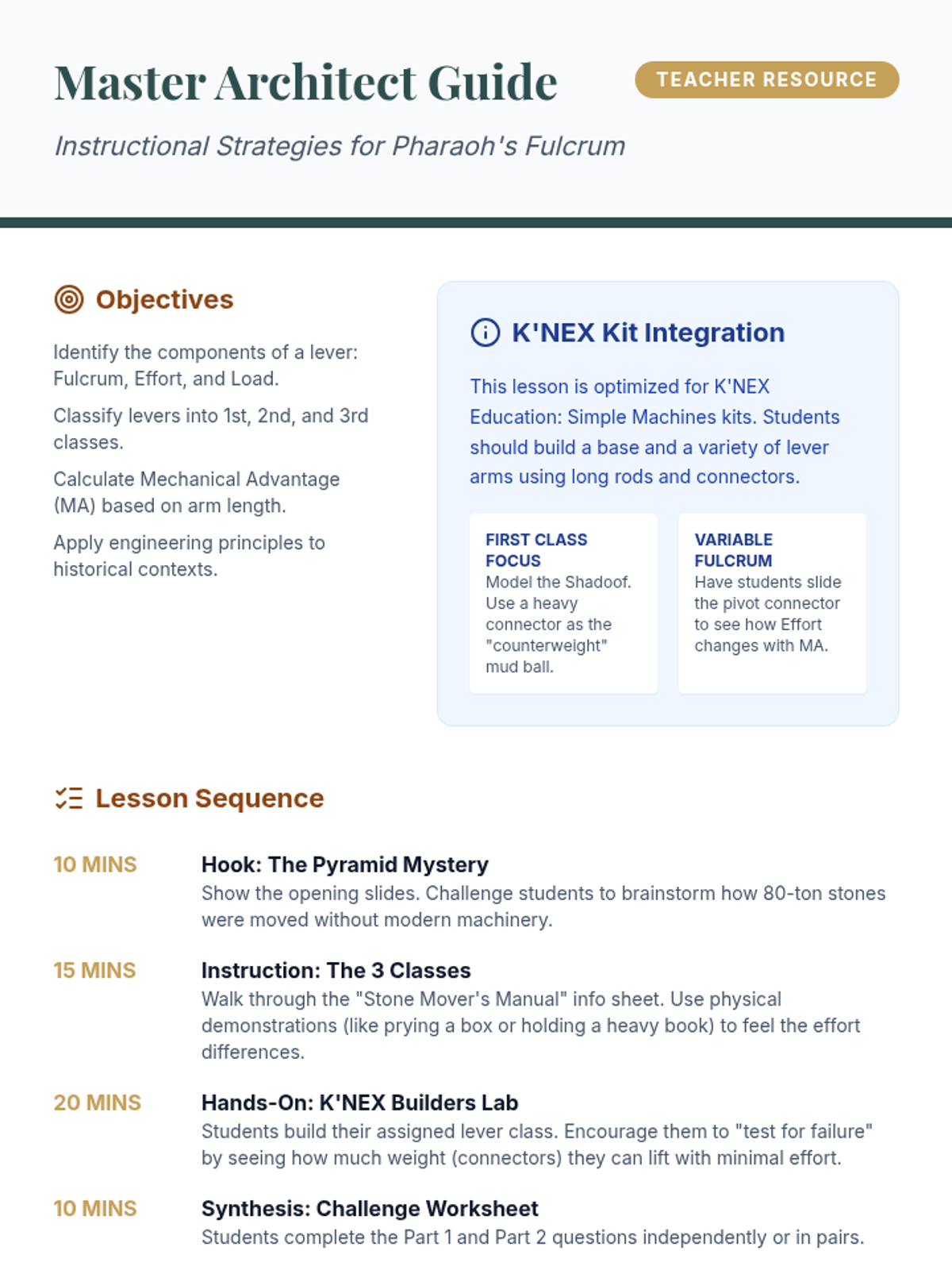 Teacher instructional guide for the Pharaoh's Fulcrum lesson, including learning objectives, pacing, K'NEX integration tips, and discussion prompts.