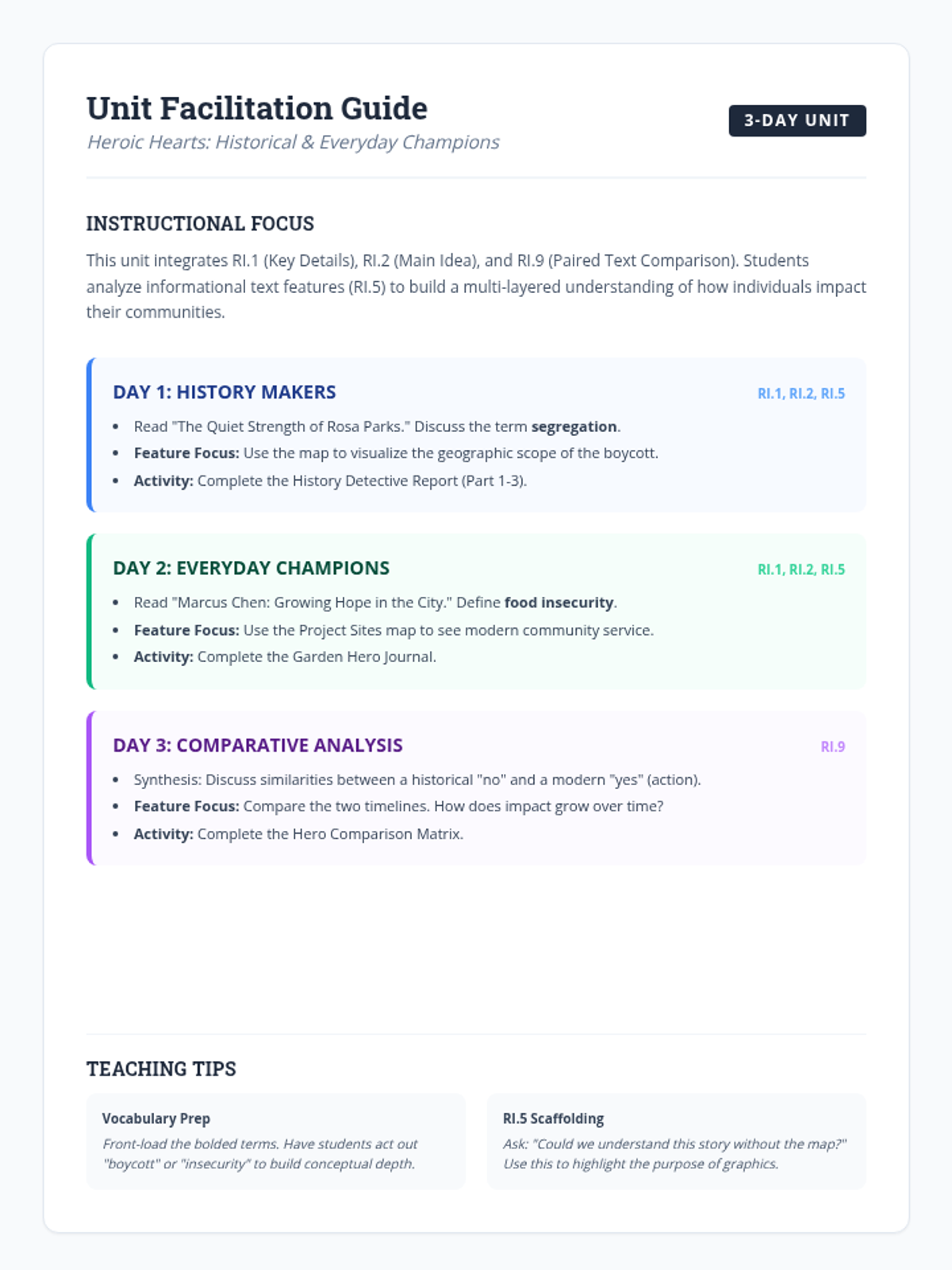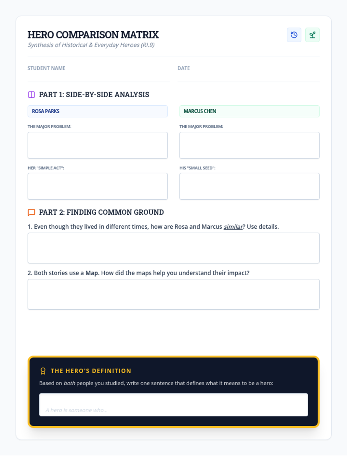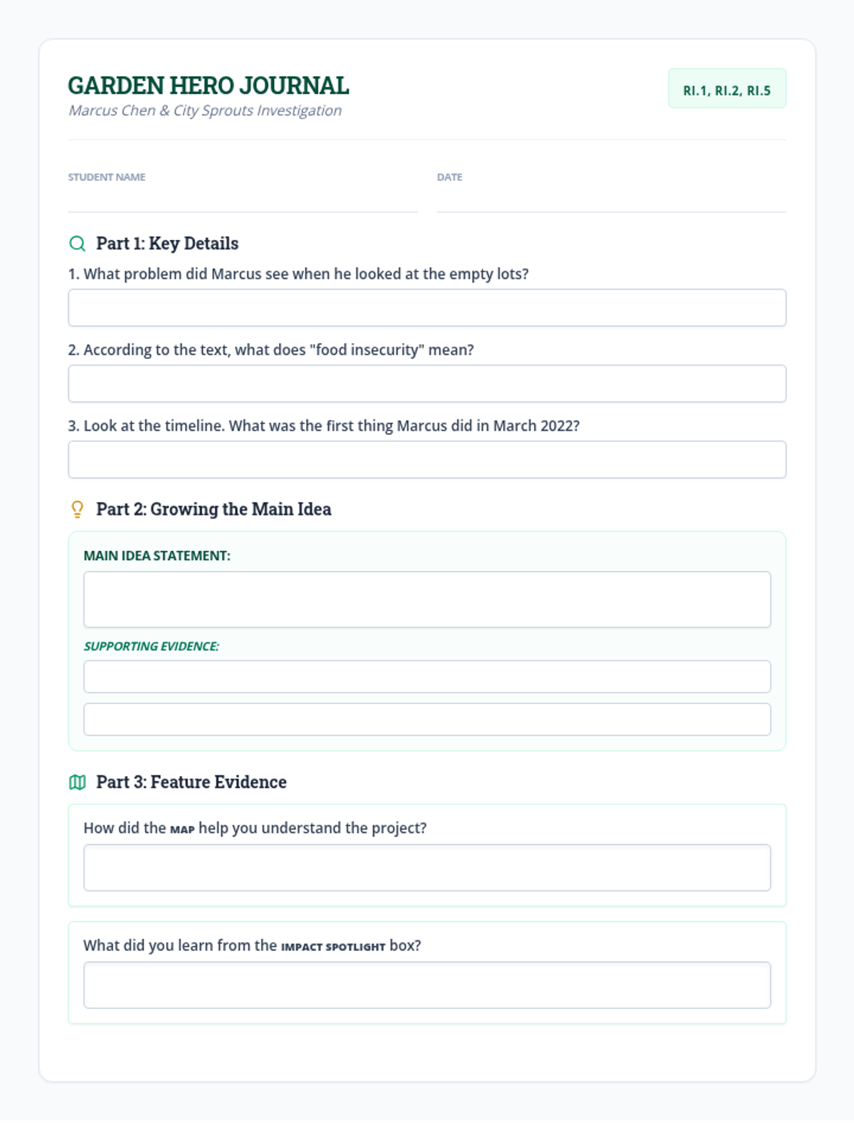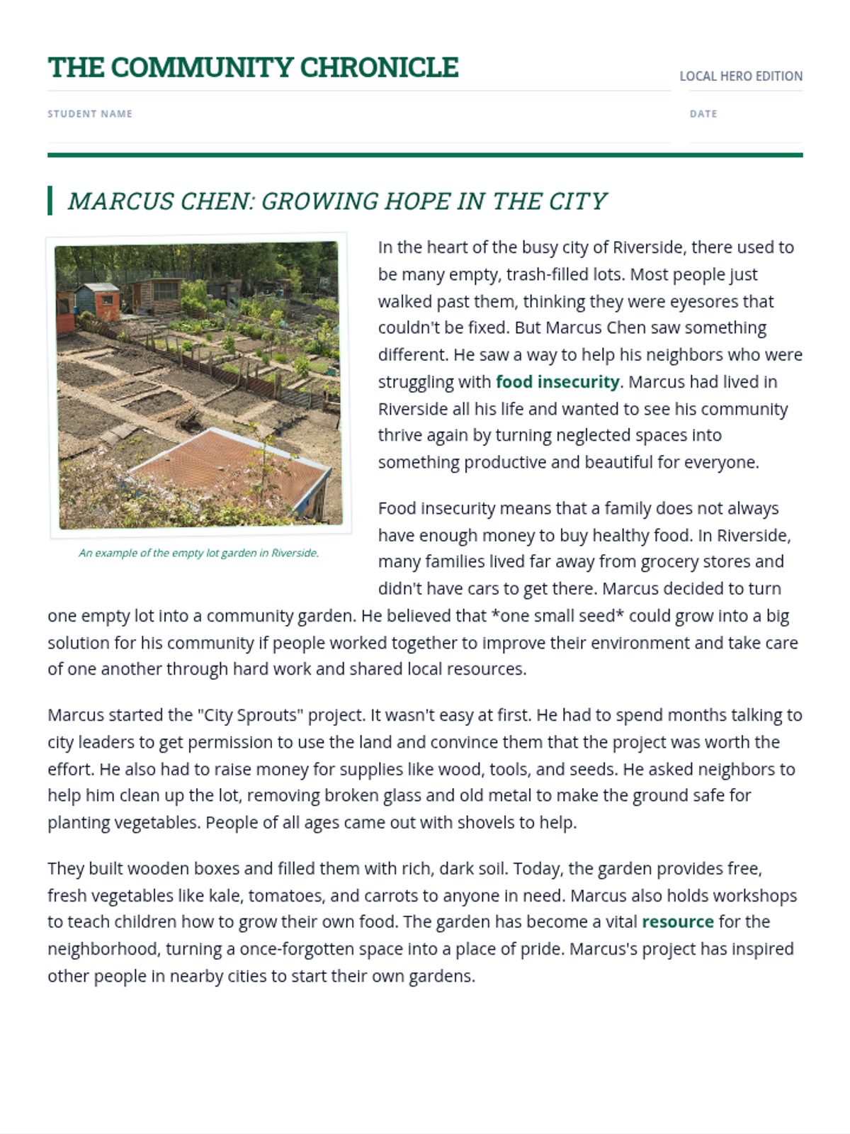 A two-page reading passage about Marcus Chen, a modern-day hero who started a community garden. Includes text features like bold vocabulary, a completed map of project sites, and a finished timeline of the project. Includes a real photo from the provided URL. Updated caption and completed map. Expanded to ~300 words for deeper comparison. Layout adjusted to ensure text wraps naturally around the photo, eliminating whitespace.