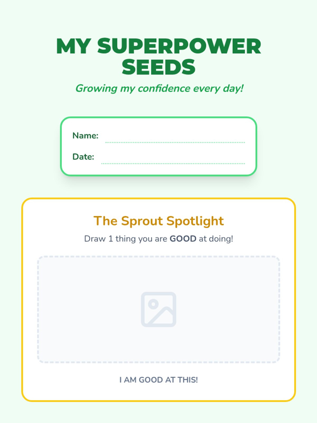 A structured 4-page student workbook featuring a drawing warm-up, strengths sorting activity, challenge checklist, and affirmation breathing practice.