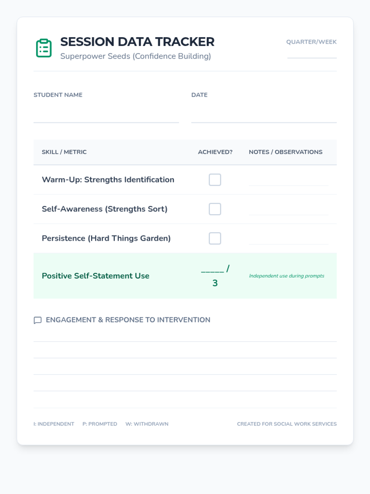 A clean, professional data tracking sheet for social workers to monitor student progress in self-awareness, persistence, and positive self-talk usage during the session.