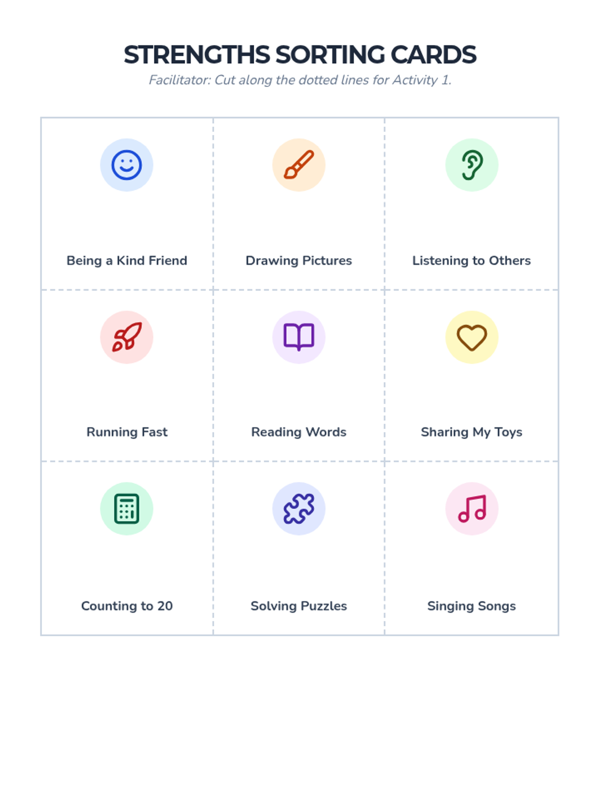 A set of nine illustrated sorting cards for early elementary students to identify personal strengths and areas for growth, now with cutting guides and darkened icons for better contrast.