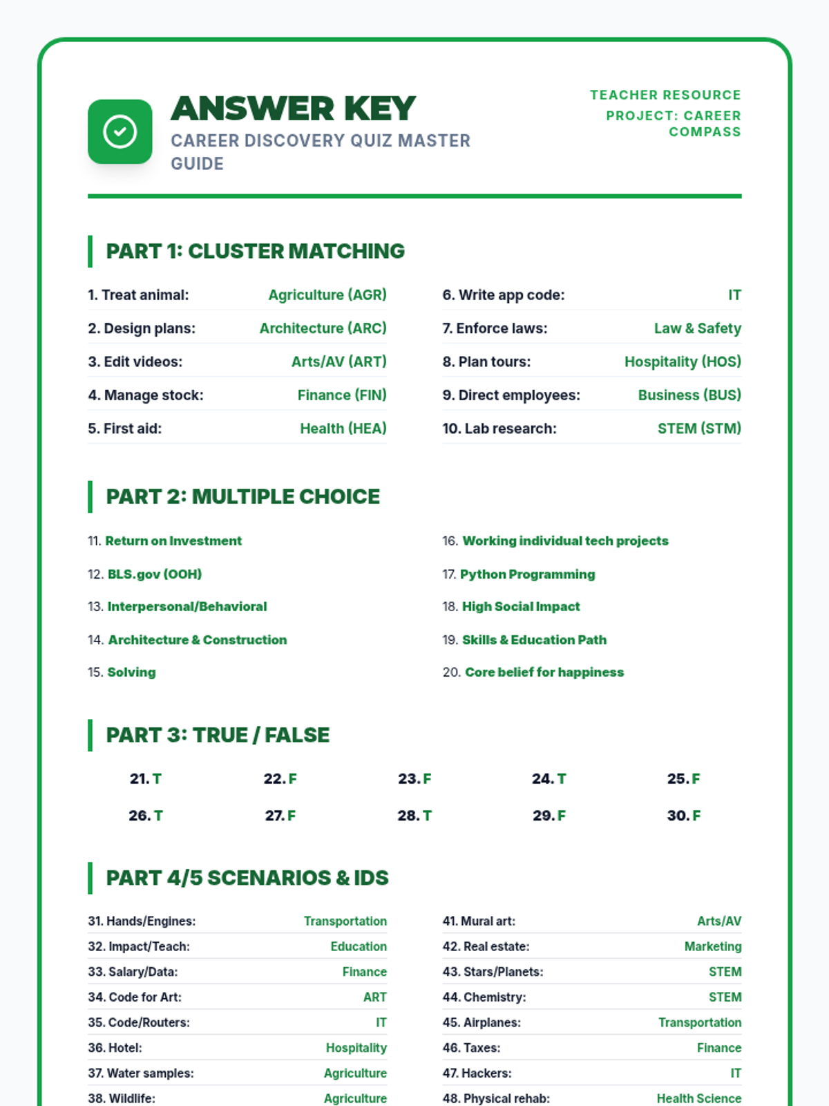 Teacher answer key for the 50-question Career Discovery Quiz. Provides clear, color-coded answers for cluster matching, terms, scenarios, and cluster identification.