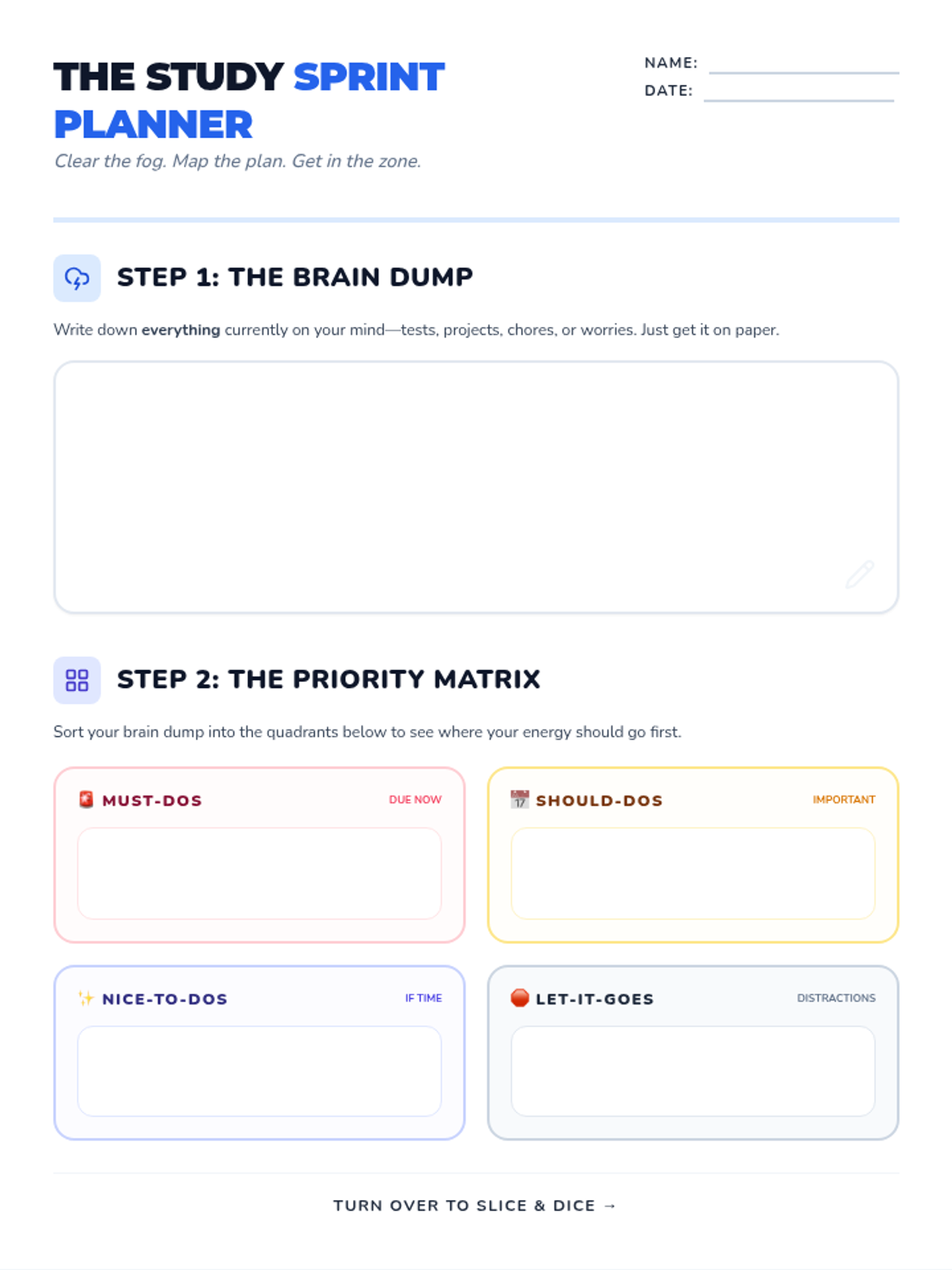 A comprehensive two-page planner for teenagers to manage testing seasons, including a brain dump, priority matrix, task slicing exercise, and a Pomodoro sprint tracker.