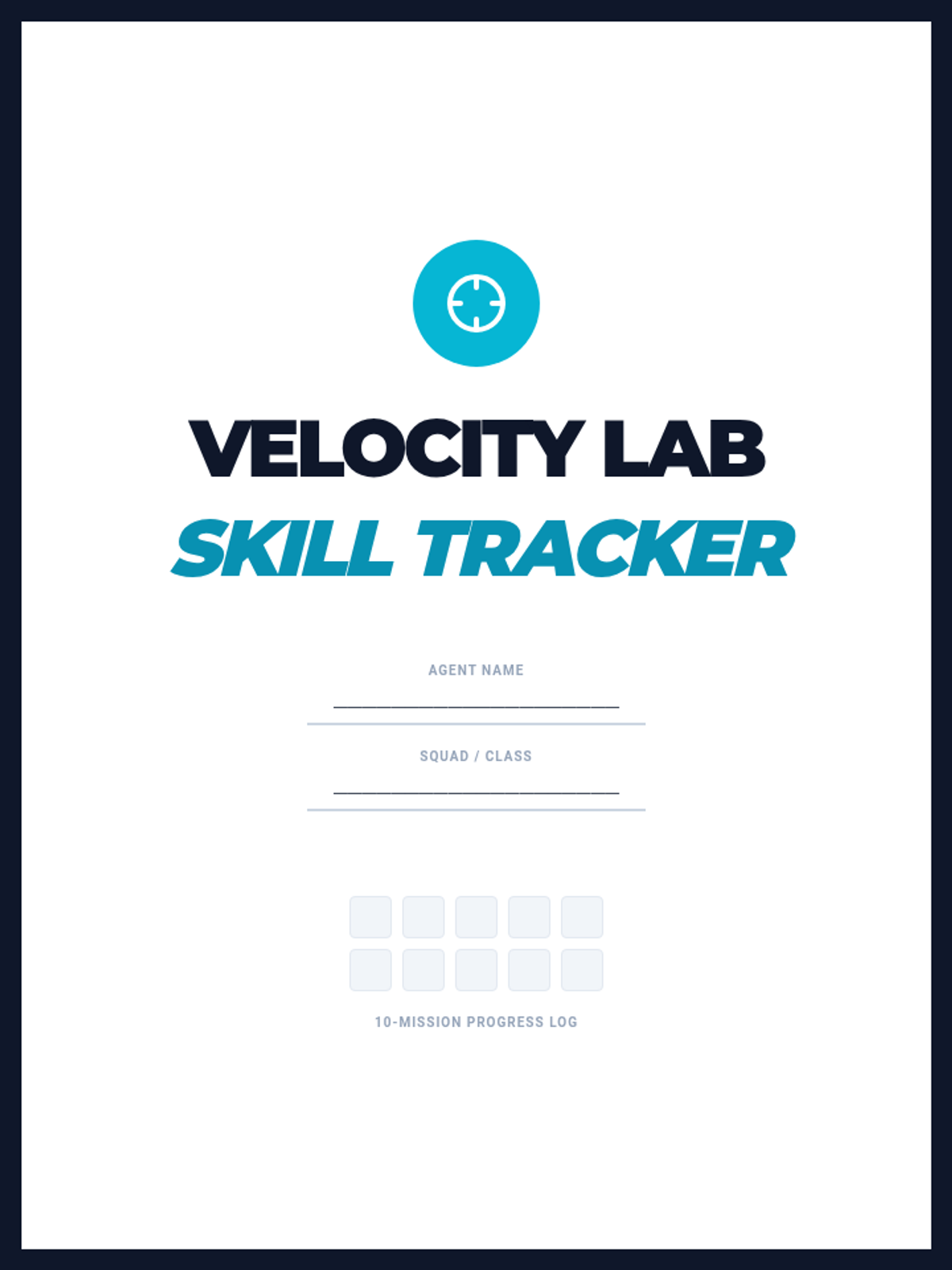 A student-facing "Velocity Lab Skill Tracker" booklet to record daily mission progress. Fixed missing days, illegible work areas, and confusing terminology. Standardized borders and signature alignment.