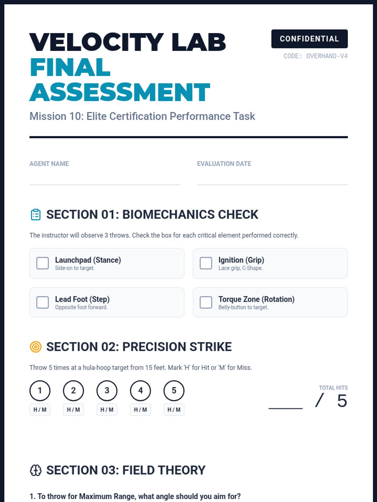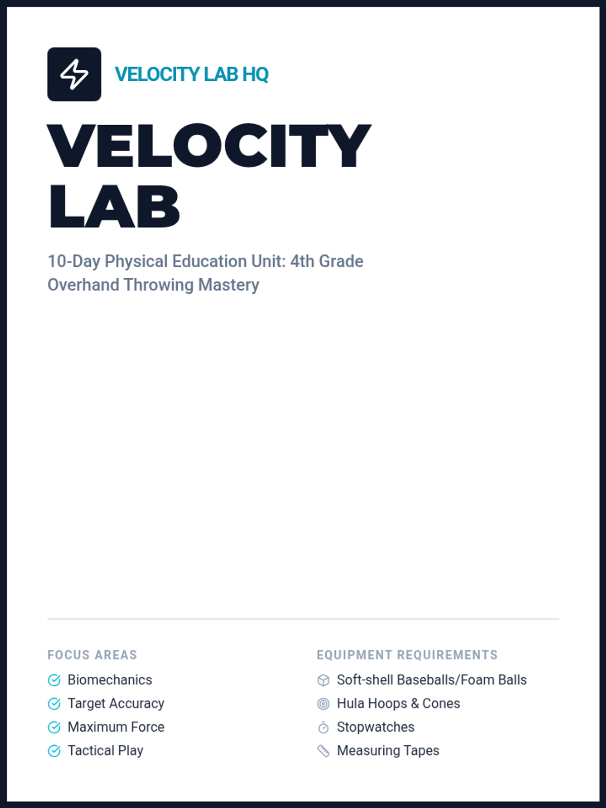 A comprehensive 10-day teacher unit guide for the "Velocity Lab" overhand throwing unit, featuring standards alignment, daily mission overviews, and safety protocols. Fixed page breaks and contrast issues.
