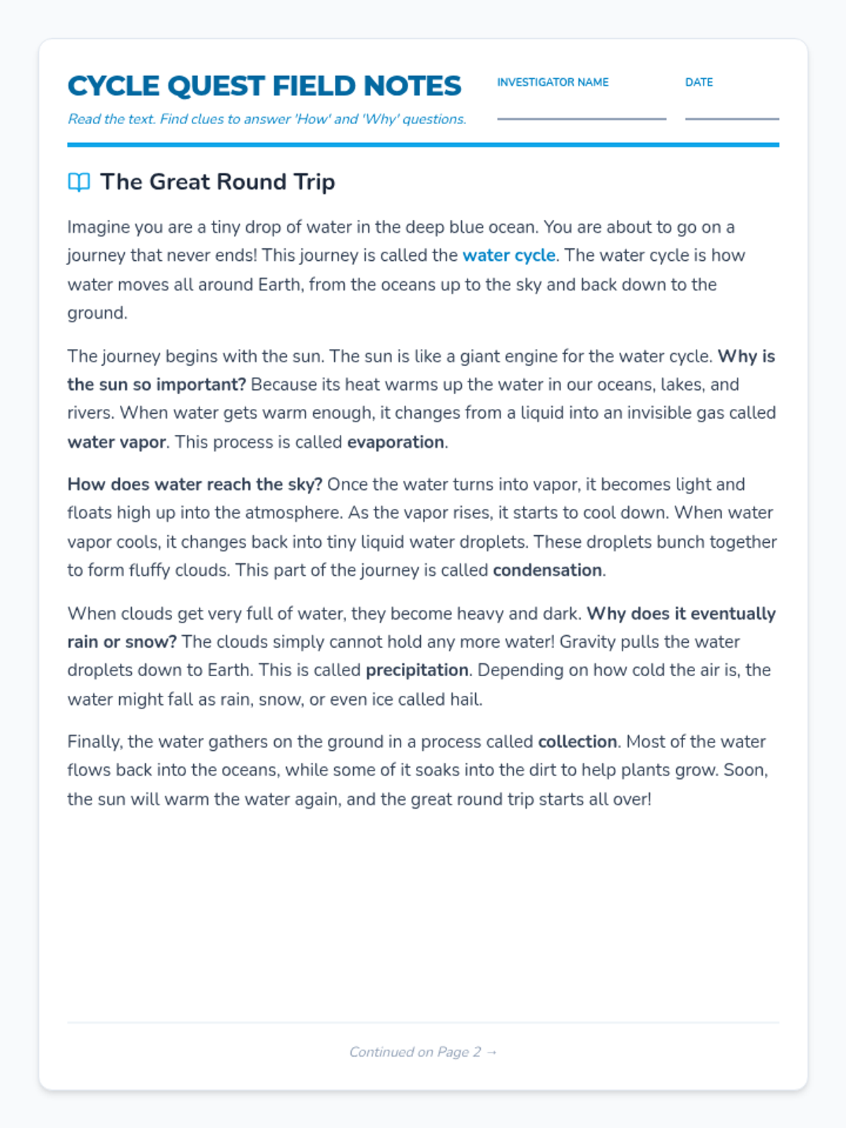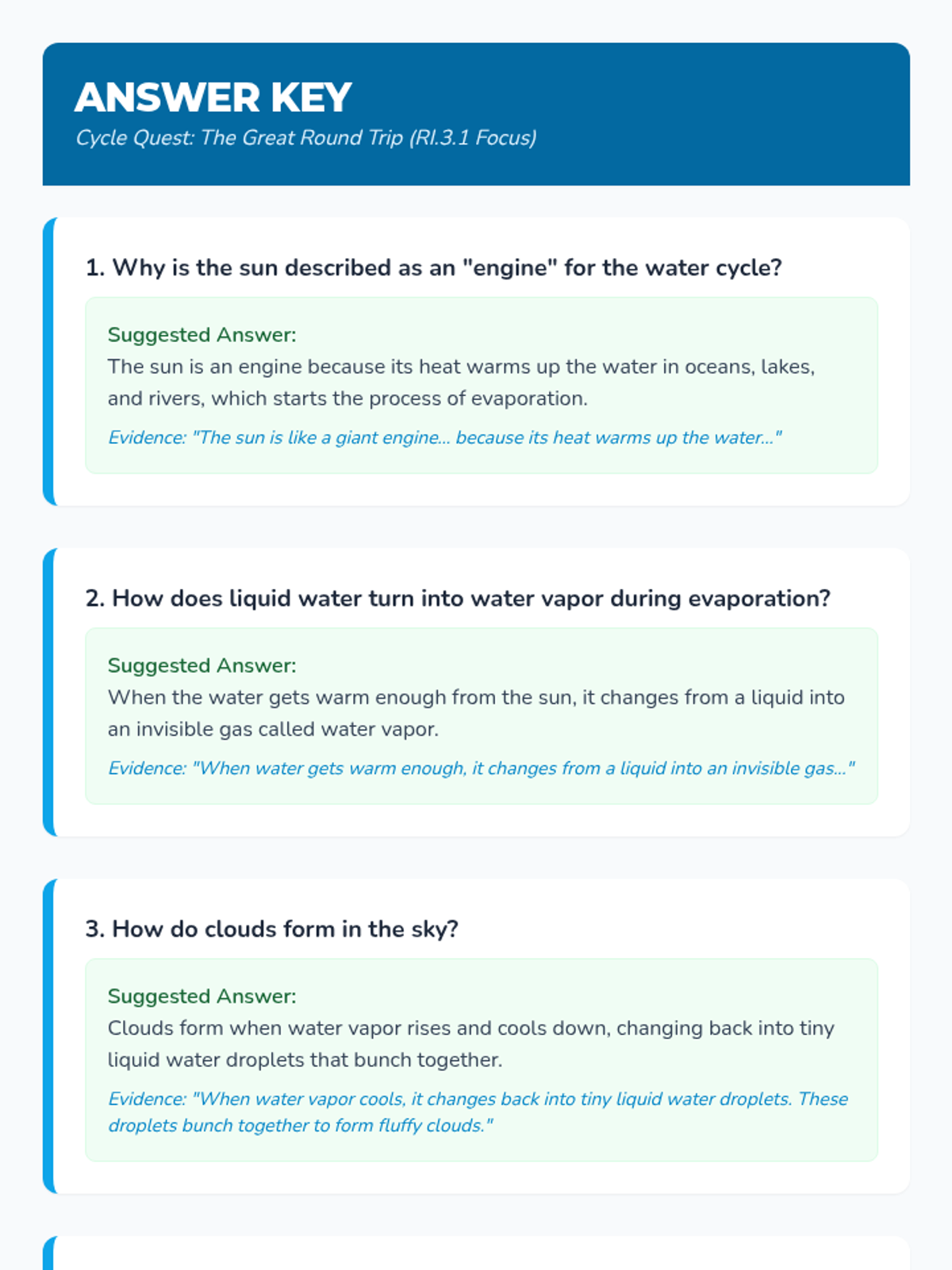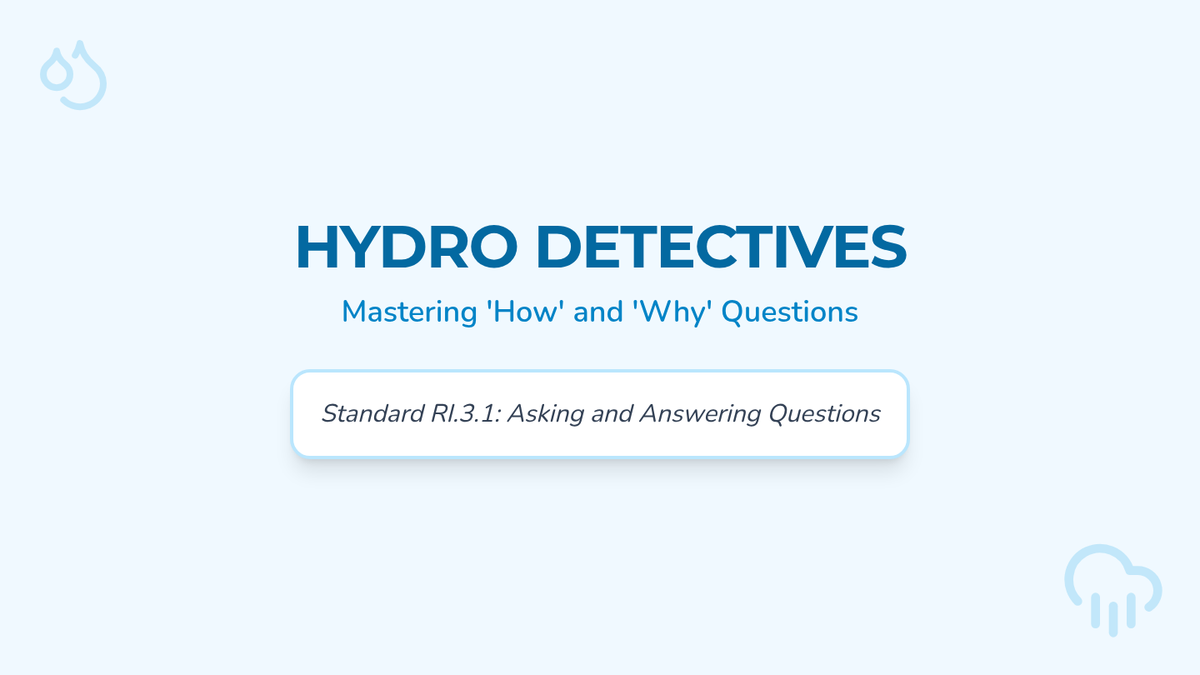 A comprehensive reading passage about the water cycle with targeted 'How' and 'Why' comprehension questions to build RI.3.1 proficiency.