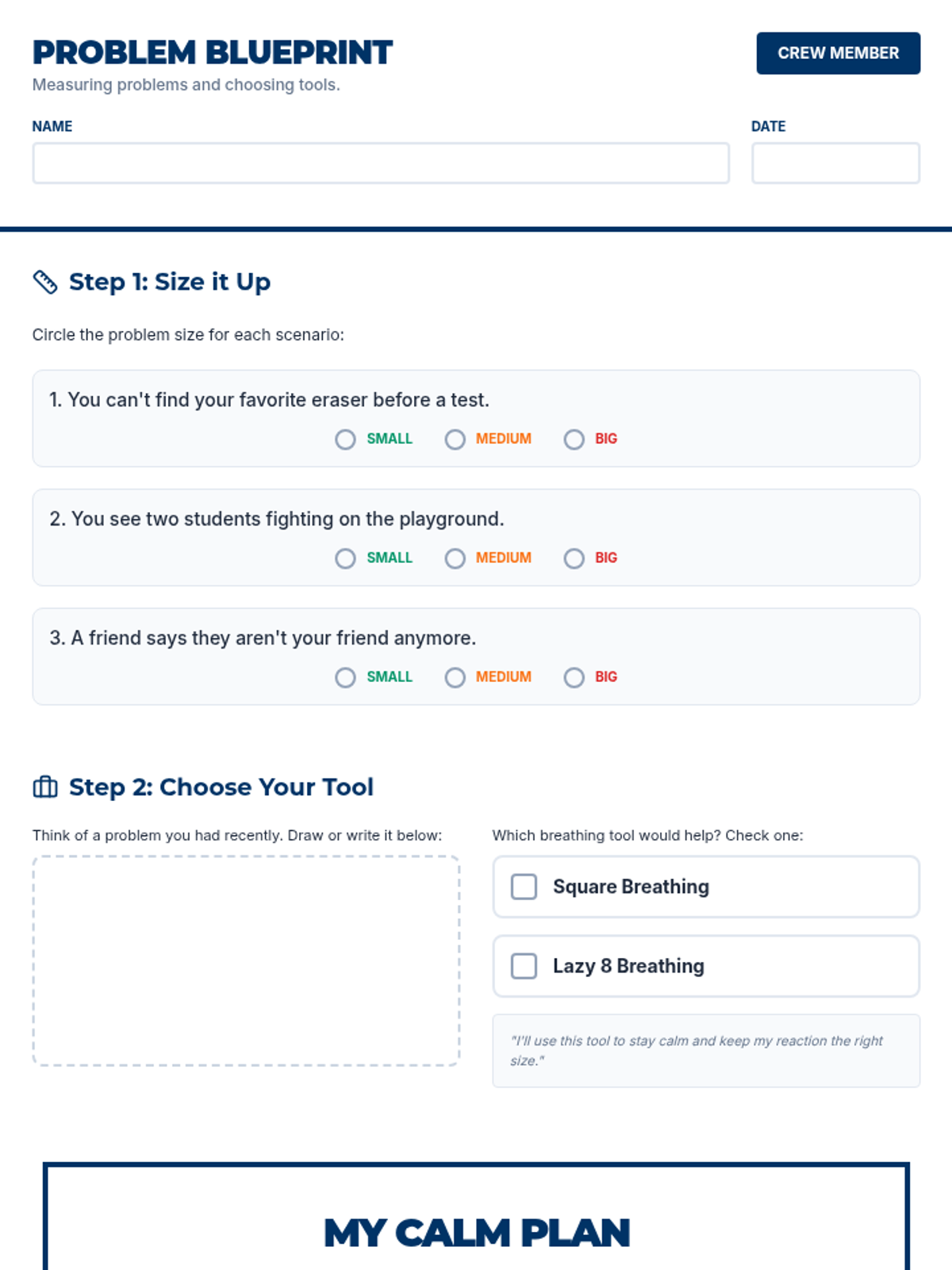 A worksheet for 3rd grade students to practice identifying the size of different problems and planning which breathing tool they will use. Updated to ensure all sections fit properly on pages and work areas have white backgrounds.