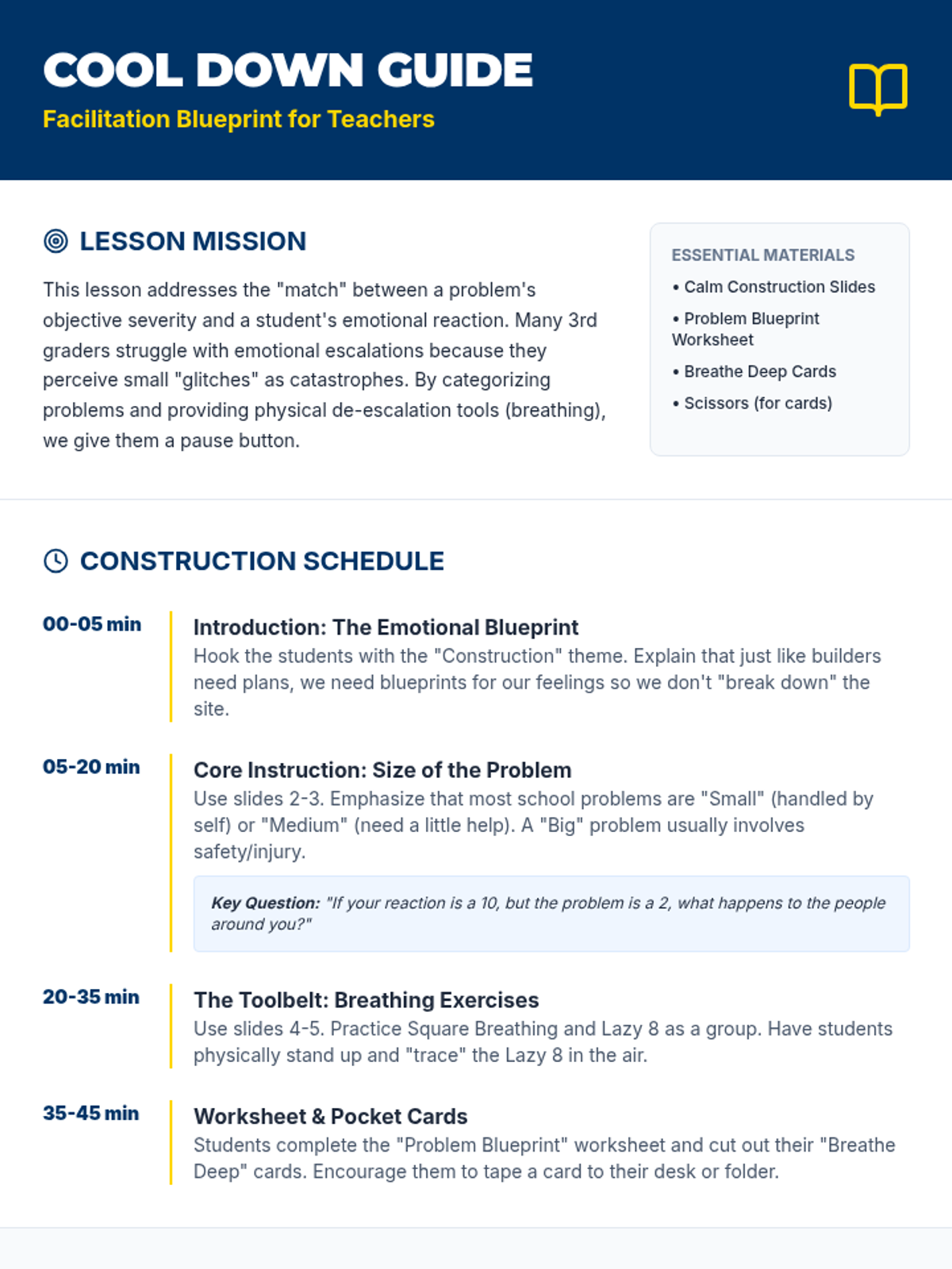 A teacher's guide for the 'Cool Down Crew' lesson, providing a pacing guide, discussion prompts, instructional strategies, and tips for addressing student misconceptions about emotional regulation.