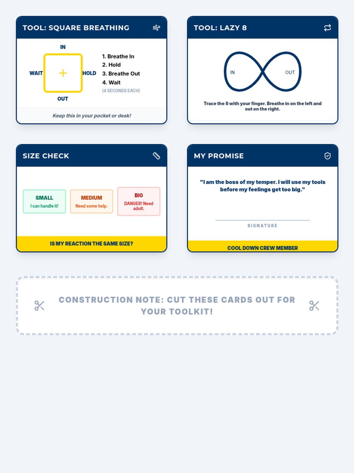 A set of four pocket-sized reference cards for 3rd graders. Updated with improved spacing for cutting, fixed text overflows on breathing guides, and high-contrast instructional text.