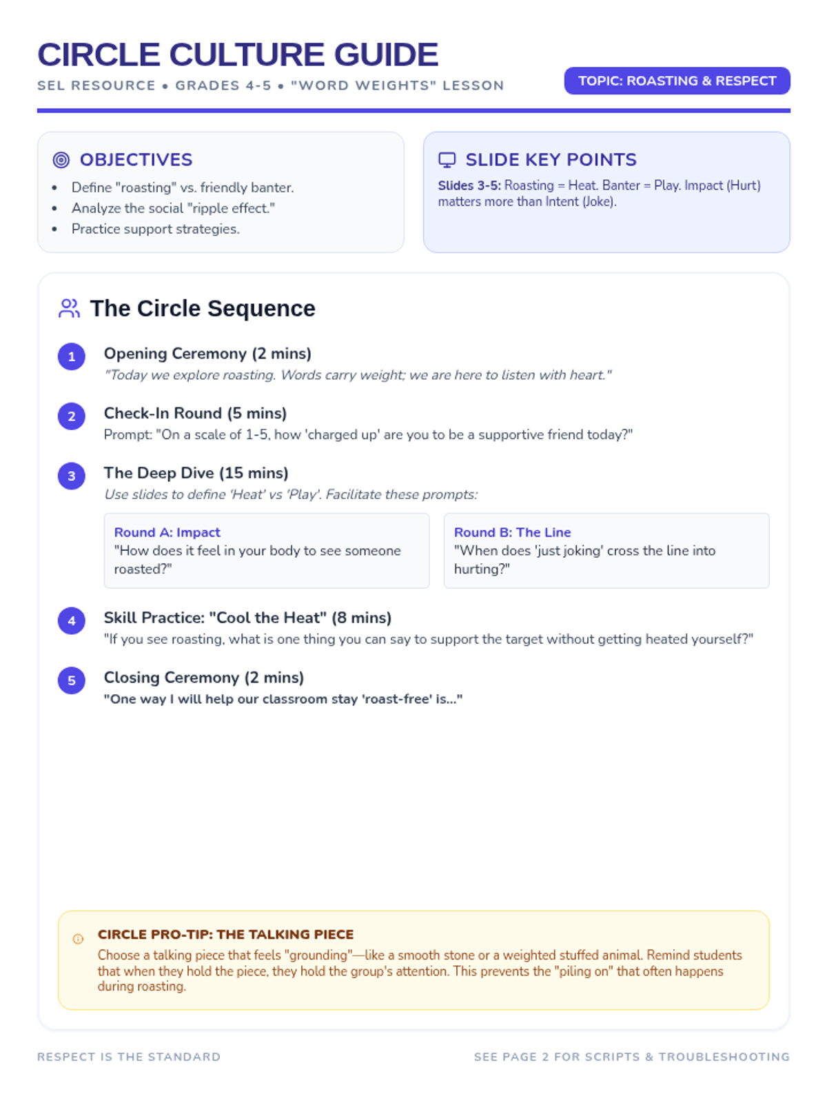 A comprehensive facilitator guide for teachers to lead a classroom circle on roasting. Includes a step-by-step sequence, talking points, and restorative scripts for managing difficult student responses.