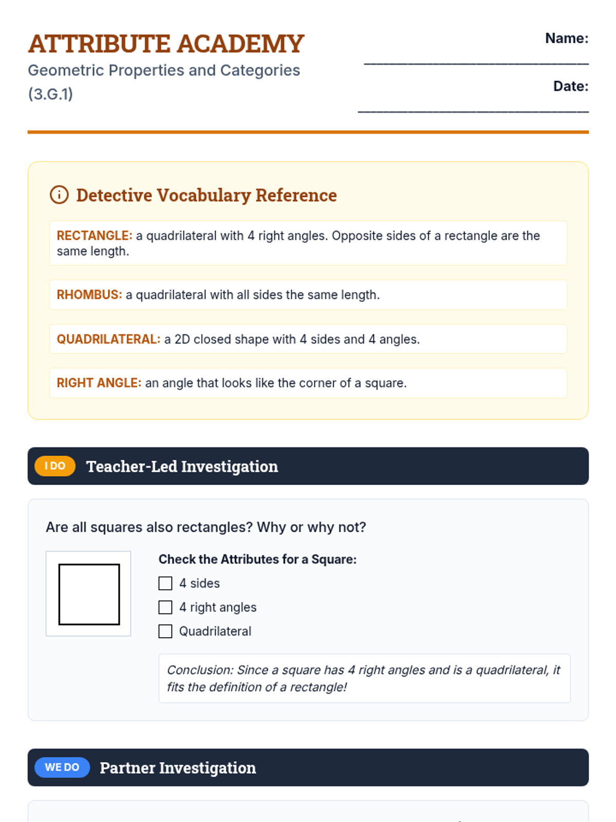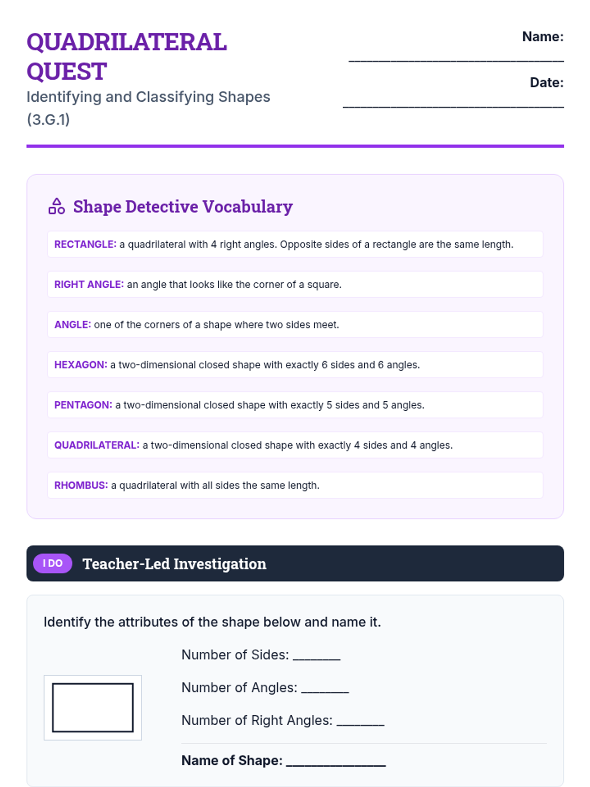 A daily worksheet for Day 3 covering 3.G.1. Revised with improved section distribution across pages and larger drawing/work areas for students.