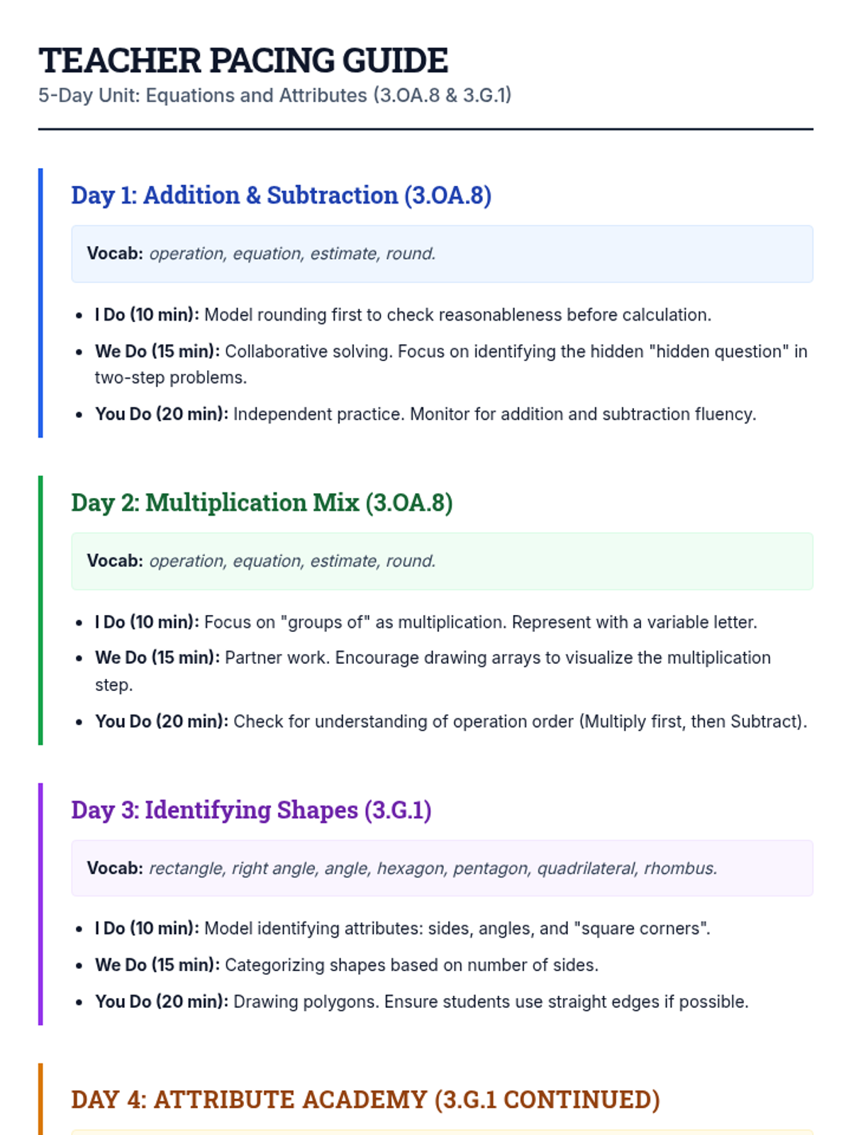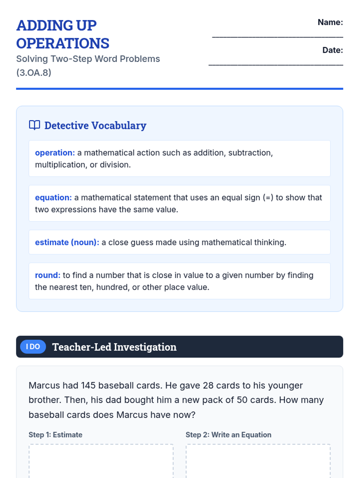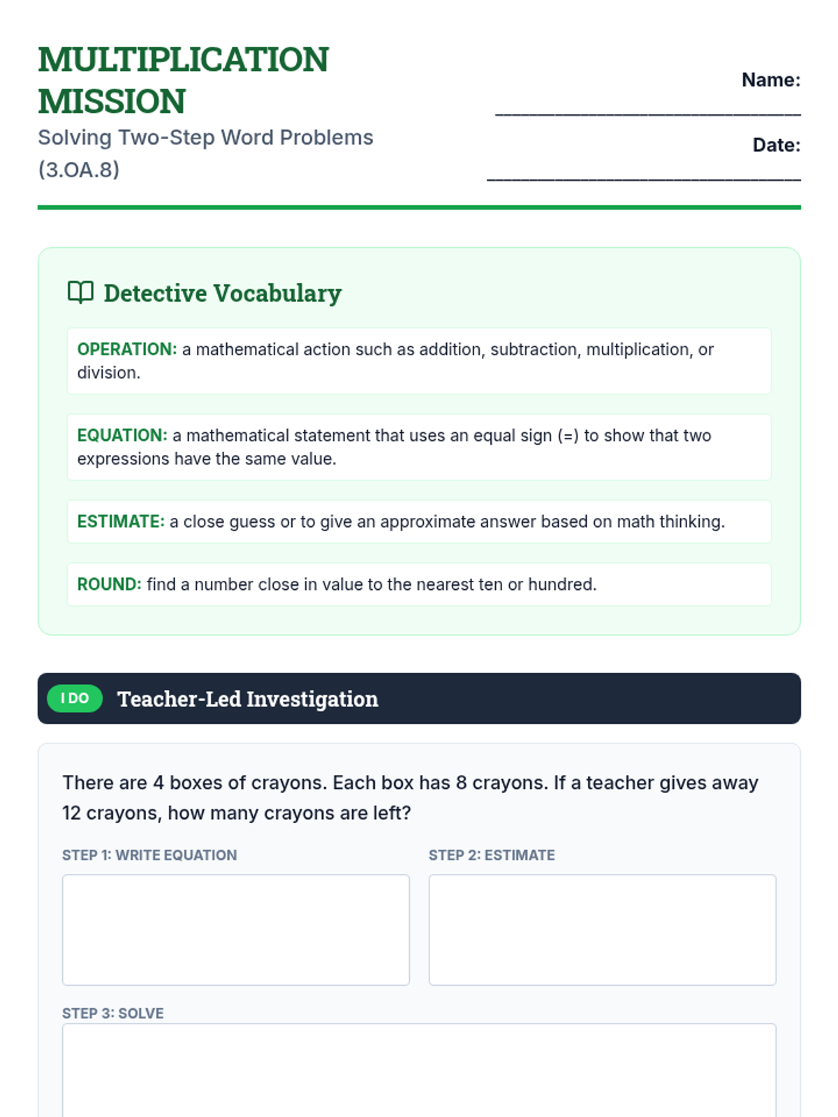 A daily worksheet for Day 1 covering 3.OA.8 (addition/subtraction). Includes a vocabulary reference, and structured sections for 'I Do', 'We Do', and 'You Do' problem-solving steps. Revised for better page breaks and layout consistency.