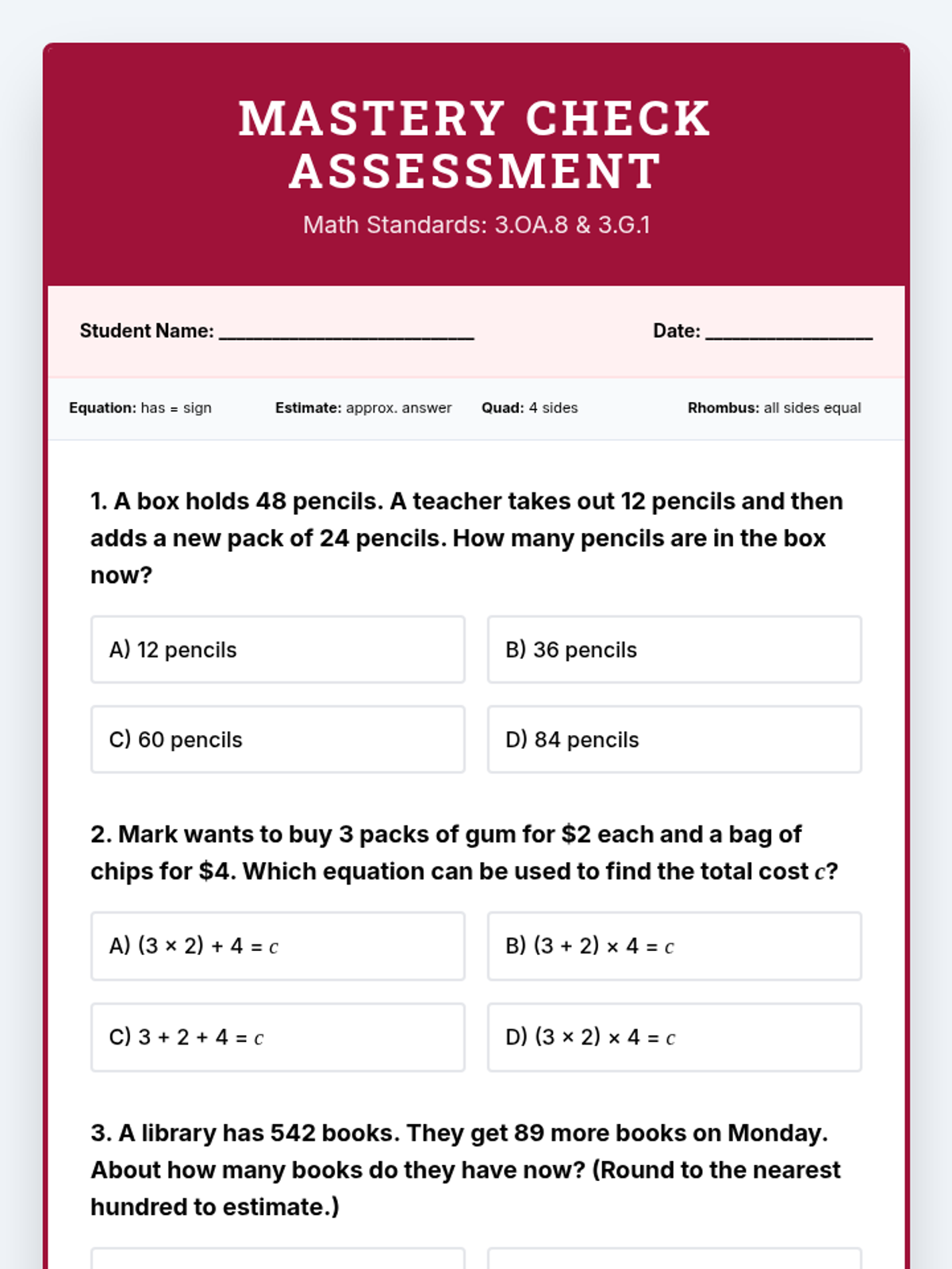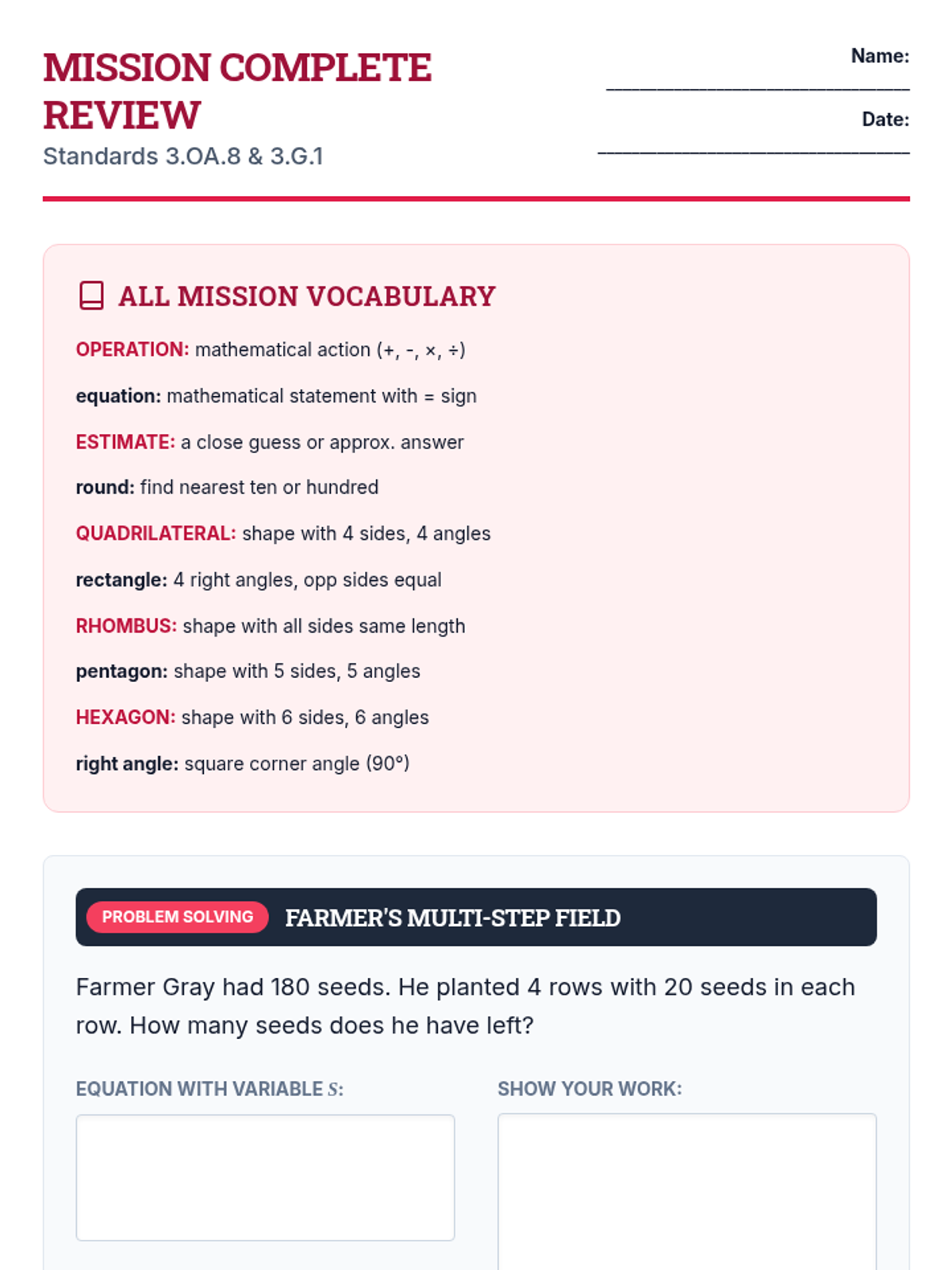 A 10-question final assessment covering 3.OA.8 and 3.G.1. Revised to eliminate awkward page breaks, standardize work area styling, and include a helpful vocabulary reference.