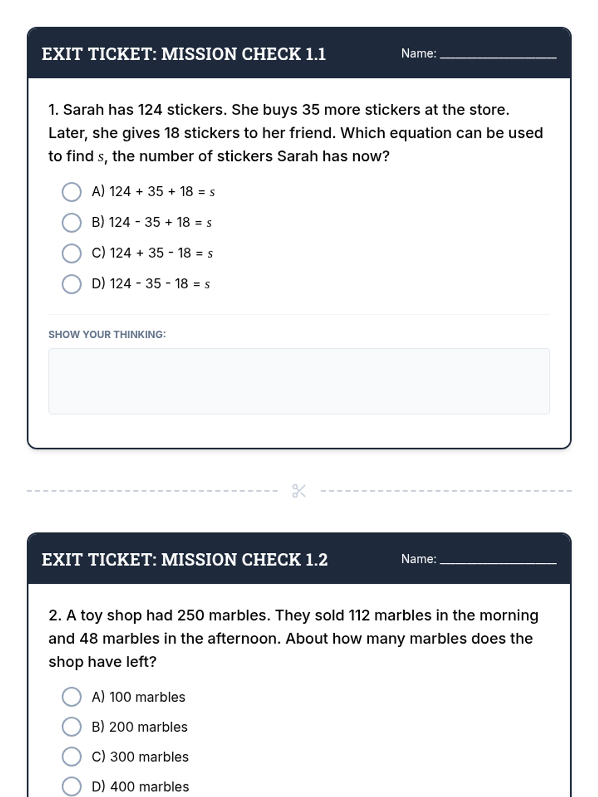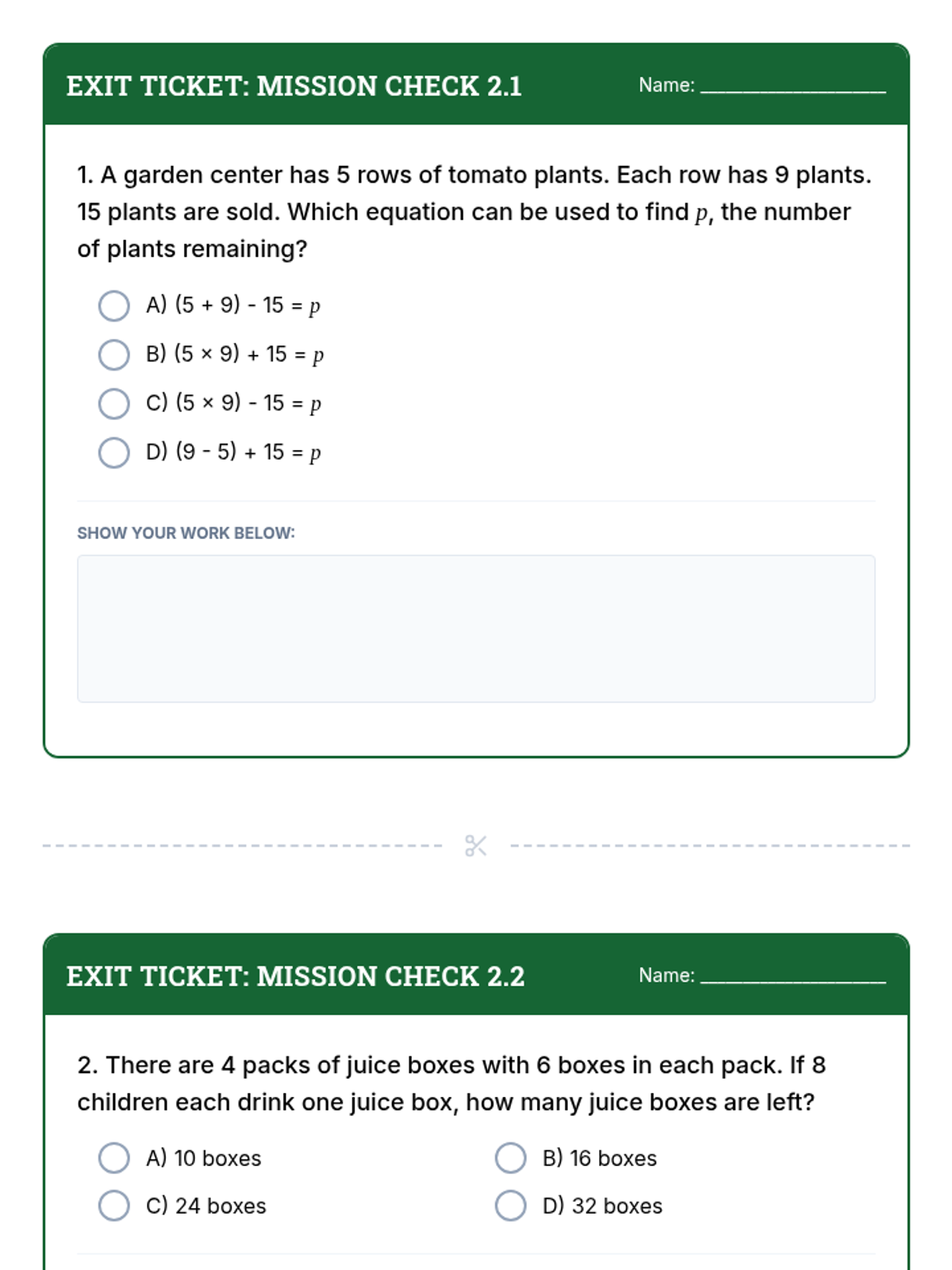 Two EOG-style exit tickets for Day 2. Revised with deeper show-your-work areas and consistent layout across both tickets.