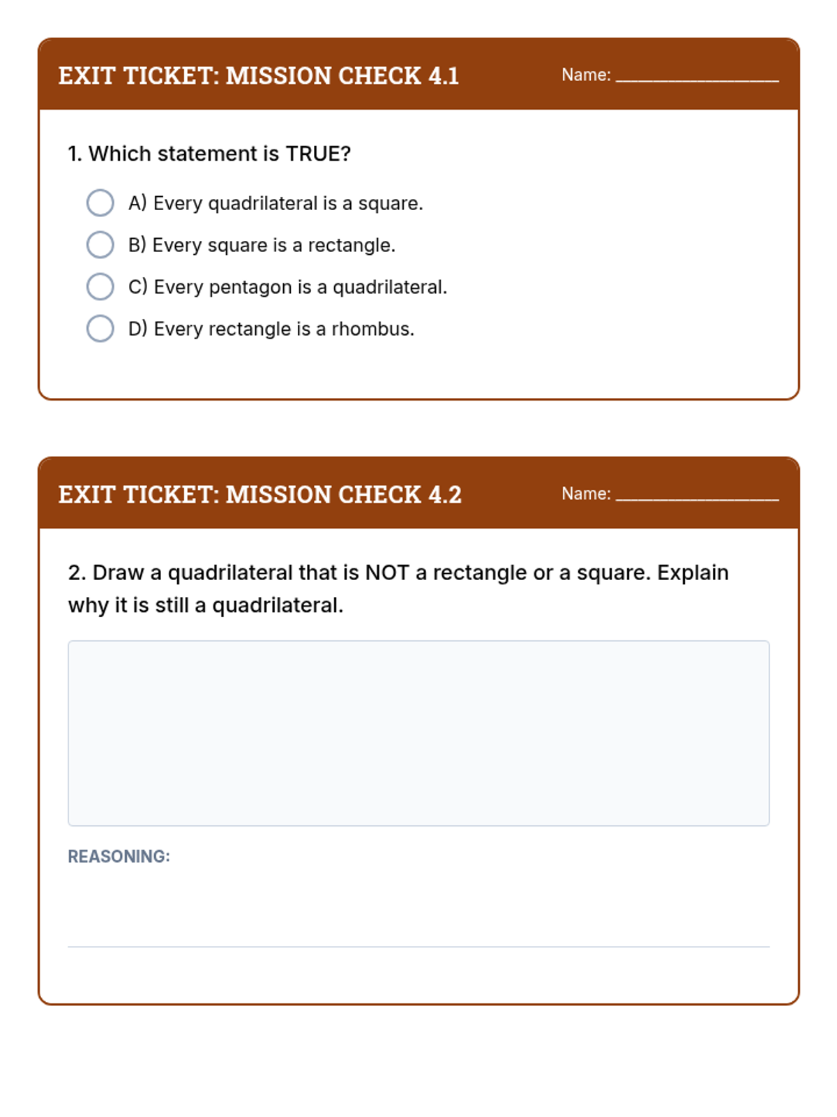 Two EOG-style exit tickets for Day 4. Focuses on logical statements about shape categories and drawing/justifying non-standard quadrilaterals.