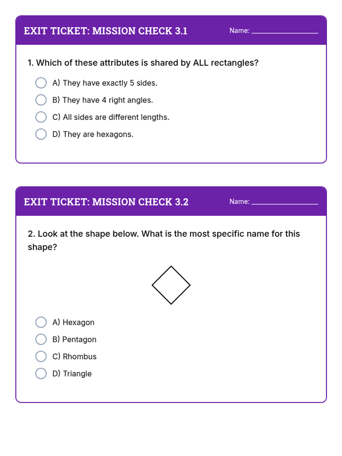 Two EOG-style exit tickets for Day 3. Focuses on identifying shared attributes of rectangles and correctly naming quadrilaterals like rhombuses.