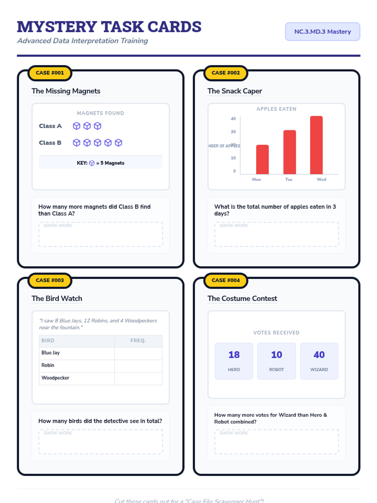 A set of four themed task cards for extra independent practice on data interpretation. Covers scaled picture graphs, bar graphs, and multi-step problem solving. Fixed layout to fit on a single page.