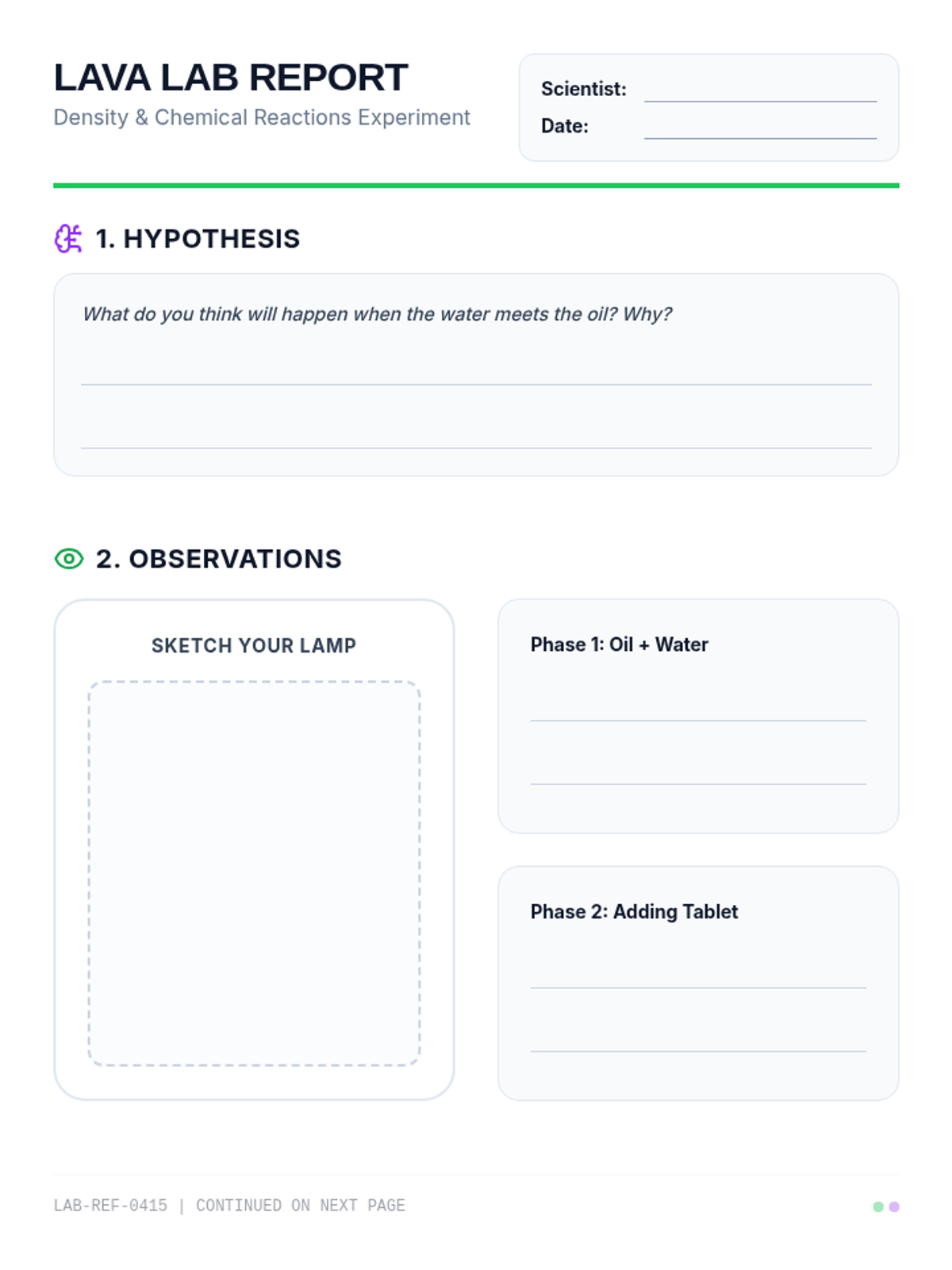 A structured lab report for students to record their hypothesis, observations with a sketch area, and analysis questions about density and the chemical reaction observed.